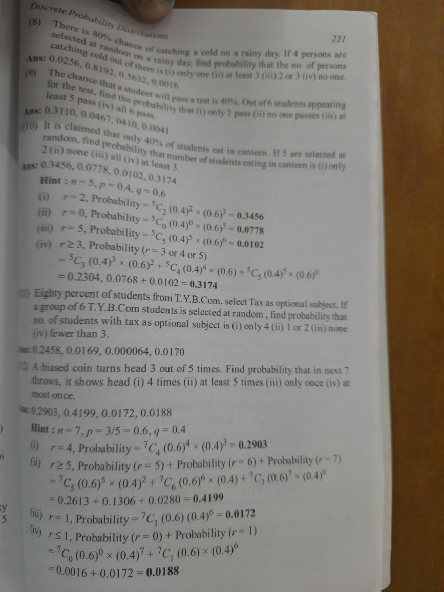 ws, , at, Shan,, Ing cop tdom, on of catching © cold on a rainy day If 4, hen tity day, find probability that th, , PASS a test ie 40%. Out of, , , , , , , , , , , , , , , , , , , , , , , , , , , , 46> r 2 pass (ii) n, It is Claimed ,, random, ¢ dn y 4 ;, 214i) none (;, aac — if Se, 03456. 0.0775..." oe a a, Miatem=s.,- 5, 703178, im r=2, Probability ca :, ) 7=0. Probabitit, cae (0.6) = 0.3456, GH) r= 5, Probability Coat 0.0778, iw) r Probability (7 6)" = 0.0102, , , , - . 3 or 4 or 5), , © 4) « 0.6) + °C, (0.4)$ x (0.6), , = 0.2304, 0.0768 + 0.0102 = 0.3174, , WW Eighty percent of students from T.Y.B.Com. select Tax, @g70up of 6 T.Y.B.Com students is ‘elected at random , f, m0. of students with tax as optional subject is (i) only 4 (ii), ity) fewer than 3, , ae0.2458. 0.0169, 0.000064, 0.0170, , ©) A biased coin turns head 3 out of 5 times, Find probability, throws, it shows head (i) 4 times (ii) at least 5 times (iii) only once, Most once,, , 70.2903, 0.4199, 0.0172, 0.0188, Hint =n =7, p = 3/5 =0.6,q= 0.4, 1) r=4, Probability = 7C, (0.6)! * (0.4)* = 0.2903, fi) r>5, Probability (r = 5) + Probability (7 ) ' Probability A, =1C, (0,6)5 (0.4)? + 7C, (0.6)° * (0.4) + Cy (0.6) (04), = 0.2613 + 0,1306 + 0.0280 = 0.4199, r= 1, Probability = 7C (0.6) (0.4)° = 0.0172, "<1, Probability (r = 0) + Probability i 1), =1G, (0.6)9 x (0.4)! + 7C, (0.6) * (0.4)", ~ 0.0016 + 0.0172 = 0.0188, , , , , , , , , , 5C. (0.4), , , , , , , , , (iii), {ivy, , b nex’