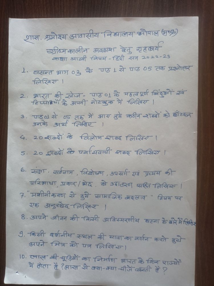 ग्रीष्मकालीन अवकाश हेतु गृहकार्य