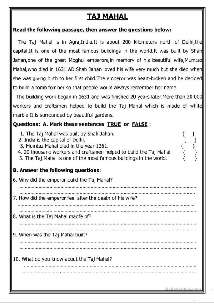 TAJ MAHAL, R followi e ., , The Taj Mahal is in Agra,India.It is about 200 kilometers north of Delhi,the}, capital.It is one of the most famous buildings in the world.It was built by Shah|, Jahan,one of the great Moghul emperors,in memory of his beautiful wife,Mumtaz|, Mahal,who died in 1631 AD.Shah Jahan loved his wife very much but she died when|, she was giving birth to her first child. The emperor was heart-broken and he decided|, to build a tomb foir her so that people would always remember her name., , The building work began in 1631 and was finished 20 years later.More than 20,000}, workers and craftsmen helped to build the Taj Mahal which is made of white}, marble. It is surrounded by beautiful gardens., , Questions: A. Mark these sentences TRUE or FALSE:, , 1. The Taj Mahal was built by Shah Jahan. ey, 2. India is the capital of Delhi. { }, 3. Mumtaz Mahal died in the year 1361. { i}, 4. 20 thousand workers and craftsmen helped to build the Taj Mahal. { }, 5. The Taj Mahal is one of the most famous buildings in the world. { }, , B. Answer the following questions:, 6. Why did the emperor build the Taj Mahal?, , , , 7. How did the emperor feel after the death of his wife?, , , , 8. What is the Taj Mahal madfe of?, , 9. When was the Taj Mahal built?, , , , , , 10. What do you know about the Taj Mahal?