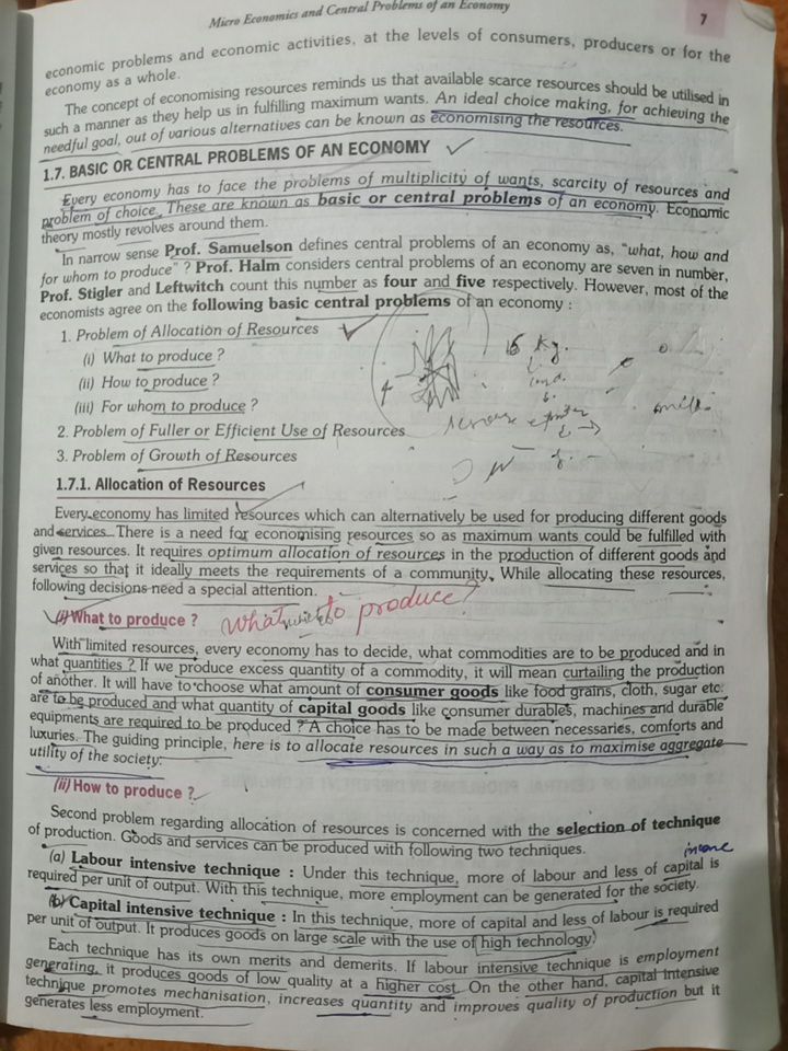 central Proviems of am Economy a, , es, at the levels of consumers, pr, * Producers or for the, , reminds us that available scarce, , , , , , , , , , , problems and, , , , nomic, as a whole, , , , , , , , sing resoure en hn, ‘ling maximum wants. An ideal choice making, us in falling be known as ECONOMIST 12 for achieving the, , , , , , : Iternatives can be! is, ECONOMY \~, , so PROBLEMS OF AN, , gasiC OR CENTRAL i, 1.7. BASIC OR ms of multiplicity of wants, scarcity of resourees, basic_or central problems of an economy irces and, s around them., , Prof. Samuelson defines central problems of an economy as, “what, how and, , °° Prof. Halm considers central problems of an economy are seven in rumba:, ftwitch count this number as four and five respectively. However, most of the, following basic central problems of'an economy :, , sai, , (ii) How to produce ? t, (ili) For whom to produce ?, 2. Problem of Fuller or Efficient Use of Resources, 3. Problem of Growth of Resources n, 1.7.1. Allocation of Resources 1, , , , , , , , , , , , , , , , theory mostly re, “in narrow sense, for whom to produce, Prof. Stigler and Le, economists agree on the je, 1. Problem of Allocation of Resources, , , , , , , , (i) What to produce ?, , , , , , , Every.economy has limited tes6urces which can alternatively be used for producing different goods, and <ervices_There is a need far economising fesources so as maximum wants fulflled with, siven resources. It requires optimum allocation of resources in the production of different goods and, serviges 50 that it ideally meets the requirements of a community, While allocating these resources,, , , , , , , , , , , , following decisions need a special attention, , , , , , , , \BMifag to produce ? who, With imited resources, every economy has to decide, what <r Sa a a, what quantities 2Tf we produce excess quantify of @ cc ‘commodity, it will mean curtailing the production, of anéther. It will have to:choose what amount of €o1 i like food grains, cloth, sugar ete:, af Tae produced and what quantity of capital goods Ie consumer durables, machines-and durable, [ROS ae rend ta be produced Tachcleetes Ws be ea aria ree ae, : : a PA chok, i] How to produce 2_ ., , , , , , , , , , , e “i . chnlgos, . — roblem Tegarding allocation of resources is concerned with the Be, , , , Giet services Produced with following two techniques.