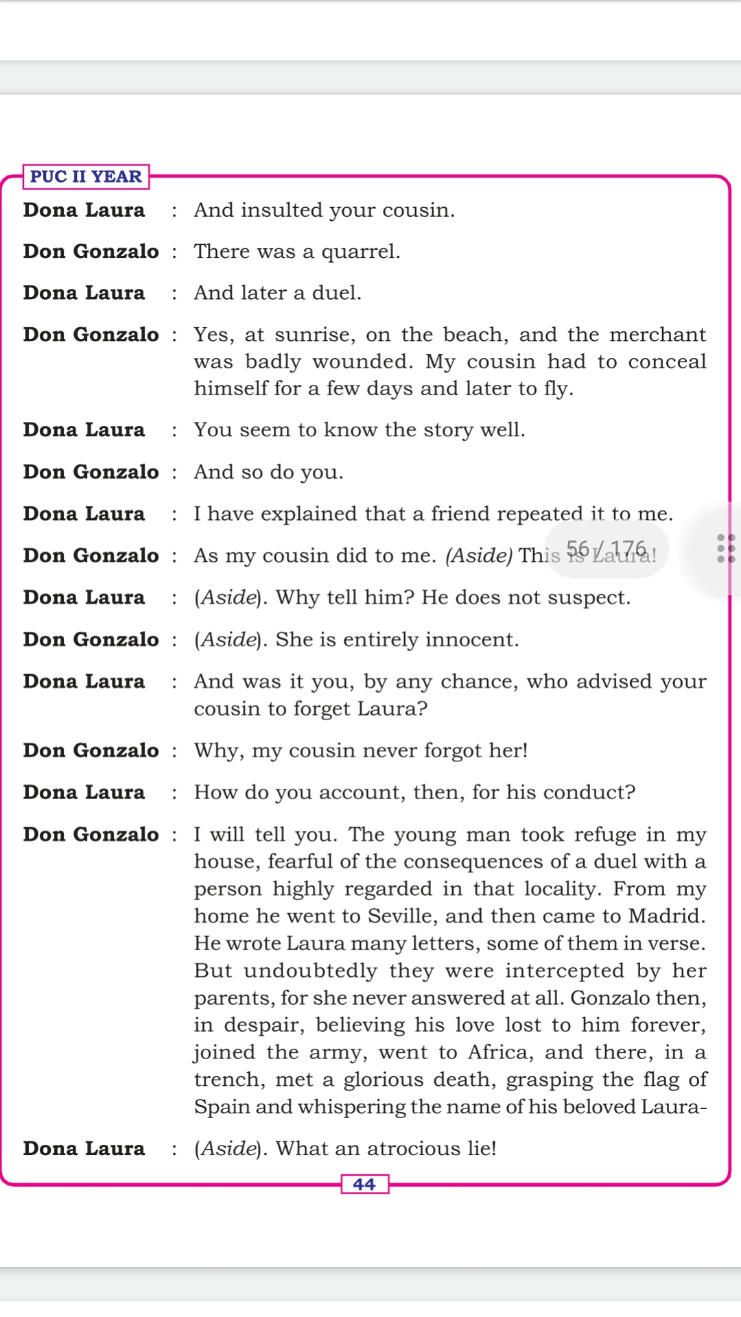PUC II YEAR, , Dona Laura, , Don Gonzalo :, , Dona Laura, , Don Gonzalo, , Dona Laura, , Don Gonzalo :, , Dona Laura, , Don Gonzalo :, , Dona Laura, , Don Gonzalo :, , Dona Laura, , Don Gonzalo :, , Dona Laura, , Don Gonzalo :, , Dona Laura, , : And insulted your cousin., , There was a quarrel., , : And later a duel., , : Yes, at sunrise, on the beach, and the merchant, , was badly wounded. My cousin had to conceal, himself for a few days and later to fly., , You seem to know the story well., And so do you., , I have explained that a friend repeated it to me., , As my cousin did to me. (Aside) This DS 7h 1!, , (Aside). Why tell him? He does not suspect., (Aside). She is entirely innocent., , And was it you, by any chance, who advised your, cousin to forget Laura?, , Why, my cousin never forgot her!, How do you account, then, for his conduct?, , I will tell you. The young man took refuge in my, house, fearful of the consequences of a duel with a, person highly regarded in that locality. From my, home he went to Seville, and then came to Madrid., He wrote Laura many letters, some of them in verse., But undoubtedly they were intercepted by her, parents, for she never answered at all. Gonzalo then,, in despair, believing his love lost to him forever,, joined the army, went to Africa, and there, in a, trench, met a glorious death, grasping the flag of, Spain and whispering the name of his beloved Laura, (Aside). What an atrocious lie!