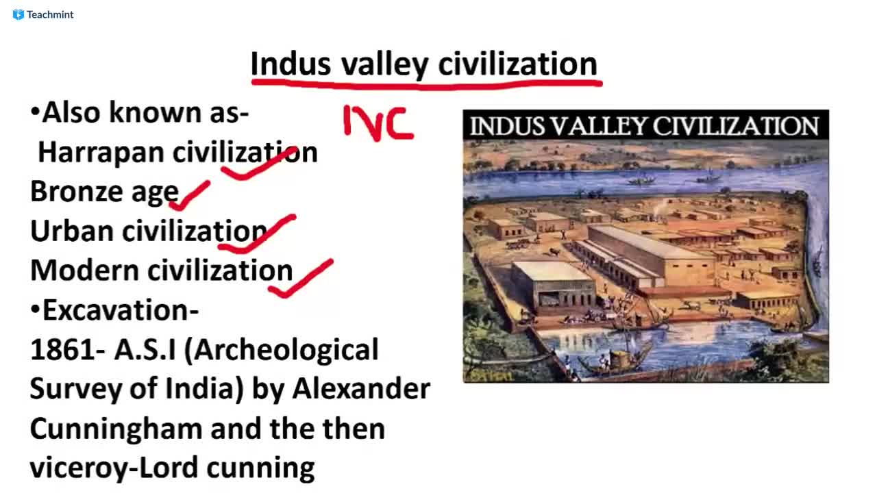 Indus valley civilization, •Also known asHarrapan civilization, Bronze age, Urban civilization, Modern civilization, •Excavation1861- A.S.I (Archeological, Survey of India) by Alexander, Cunningham and the then, viceroy-Lord cunning