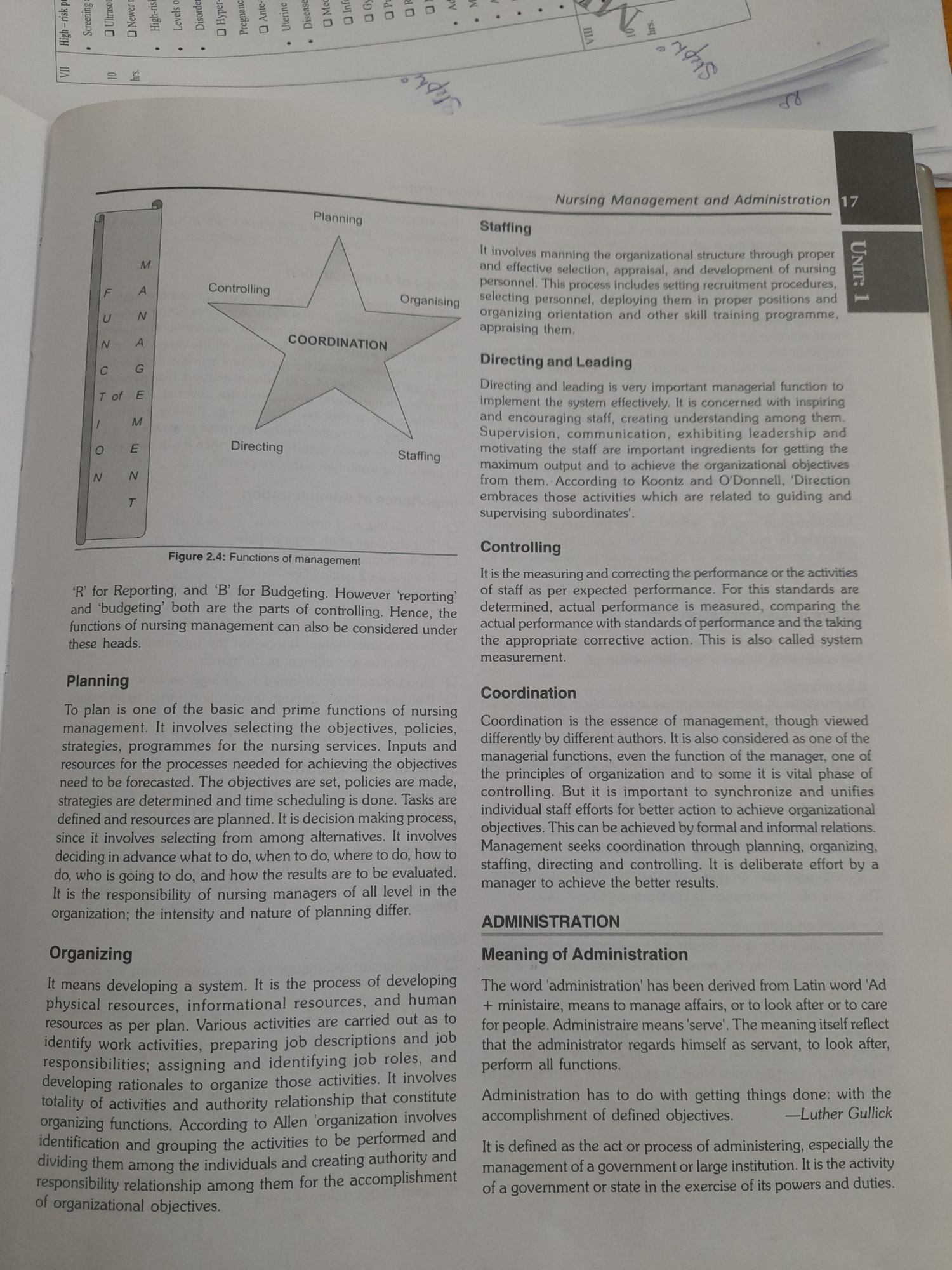 O Ultrasor, Disordel, aG, , , , High - risk p, , , , , , , , , , , , , = ord, _, Planning, q, M, A Controllin,, le z Organising, u oN ae, In A COORDINATION ~~, \ ; Z, | cc G, IT of E, le, ; Direct, | 0 E ecuny Staffing, N, a, , , , , , Figure 2.4: Functions of management, , ‘R’ for Reporting, and ‘B’ for Budgeting. However ‘Yeporting’, and ‘budgeting’ both are the parts of controlling. Hence, the, functions of nursing management can also be considered under, these heads., , Planning, , To plan is one of the basic and prime functions of nursing, management. It involves selecting the objectives, policies,, strategies, programmes for the nursing services. Inputs and, resources for the processes needed for achieving the objectives, need to be forecasted. The objectives are set, policies are made,, strategies are determined and time scheduling is done. Tasks are, defined and resources are planned. It is decision making process,, since it involves selecting from among alternatives. It involves, deciding in advance what to do, when to do, where to do, how to, do, who is going to do, and how the results are to be evaluated., It is the responsibility of nursing managers of all level in the, organization; the intensity and nature of planning differ., , , , , , , , , , , Organizing, , It means developing a system. It is the process of developing, Physical resources, informational resources, and human, Tesources as per plan. Various activities are carried out as to, , tify work activities, preparing job descriptions and job, ‘esponsibilities; assigning and identifying job roles, and, leveloping rationales to organize those activities. It involves, ity of activities and authority relationship that constitute, g functions. According to Allen ‘organization involves, ification and grouping the activities to be performed and, them among the individuals and creating authority and, ty relationship among them for the accomplishment, , , , , , Nursing Management and Administration |y, , Stafting, , It involves manning the organizational structure through proper S, and effective selection, appraisal, and development of nursing Ji, Personnel, This process includes setting recruitment procedures, (aH, selecting personnel, deploying them in proper positions and [iam, Organizing orientation and other skill training programme,, appraising them., , Directing and Leading, , Directing and leading is very important managerial function to, , implement the system effectively. It is concerned with inspiring, , and encouraging staff, creating understanding among them, , Supervision, communication, exhibiting leadership and, motivating the staff are important ingredients for getting the, maximum output and to achieve the organizational objectives, from them. According to Koontz and O'Donnell, ‘Direction, embraces those activities which are related to guiding and, supervising subordinates’., , , , Controlling, , It is the measuring and correcting the performance or the activities, of staff as per expected performance. For this standards are, determined, actual performance is measured, comparing the, actual performance with standards of performance and the taking, the appropriate corrective action. This is also called system, measurement., , Coordination, , Coordination is the essence of management, though viewed, differently by different authors. It is also considered as one of the, managerial functions, even the function of the manager, one of, the principles of organization and to some it is vital phase of, controlling. But it is important to synchronize and unifies, individual staff efforts for better action to achieve organizational, objectives. This can be achieved by formal and informal relations., Management seeks coordination through planning, organizing,, staffing, directing and controlling. It is deliberate effort by a, manager to achieve the better results., , ADMINISTRATION, , , , Meaning of Administration, , The word ‘administration’ has been derived from Latin word 'Ad, + ministaire, means to manage affairs, or to look after or to care, for people. Administraire means 'serve'. The meaning itself reflect, that the administrator regards himself as servant, to look after,, perform all functions., , Administration has to do with getting things done: with the, accomplishment of defined objectives. —Luther Gullick, , It is defined as the act or process of administering, especially the, management of a government or large institution. It is the activity, of a government or state in the exercise of its powers and duties.