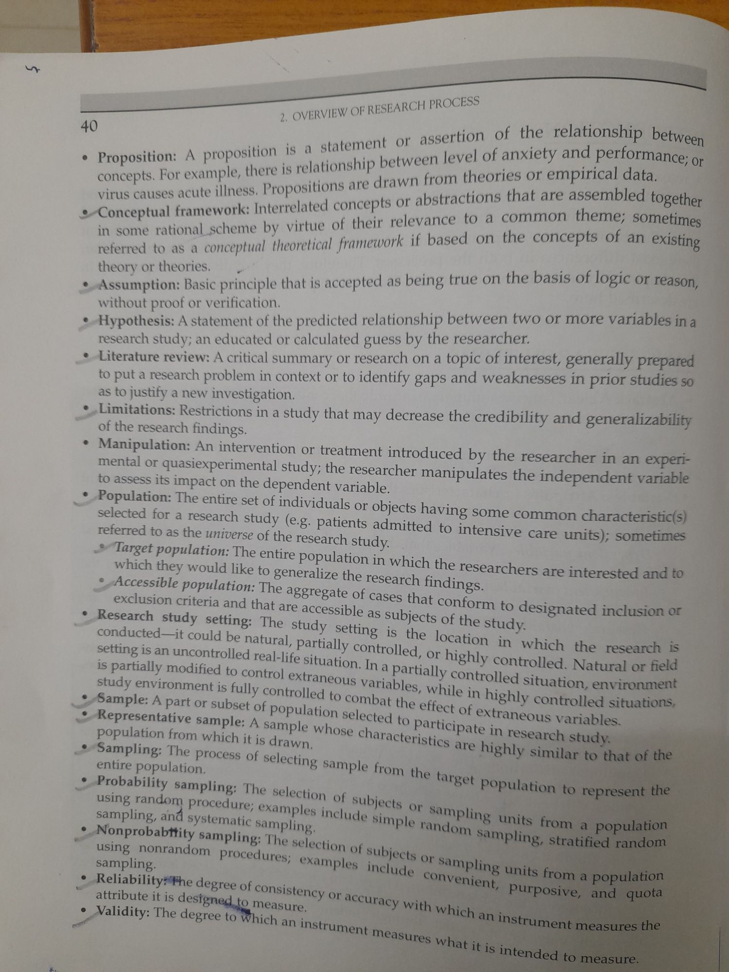 5} SESS, 2, OVERVIEW OF RESEARCH PROCE, , 40 satemerit OF assertion of the ae between, ition: roposition is a state’ on level of anxiety and performance; oy, , * Proposition: A propos sig relationship between level of ¢ irical data. am, , concepts. For example, there 1s Fe'¢ heories or emp a., , ‘ong are drawn from t, aia ae se ra or abstractions that are assembled togethe;, ‘k: Interrelated con, Conceptual framewor, , tena » to a common theme; sometimes, in some rational_scheme by virtue oe hae on the concepts of an exis ting, referred to as a conceptual theoretical framework |, , theory or theories. , 7 asis of logic Sama, Assumption: Basic principle that is accepted as being true on the b gi son, q, , vithout proof or verification. : :, Frostiote A statement of the predicted relationship between two or more variables ina, research study; an educated or calculated guess by the researcher., Literature review: A critical summary or research on a topic of interest, generally Prepared ", to puta research problem in context or to identify gaps and weaknesses in prior studies so §, as to justify a new investigation. ., Limitations: Restrictions in a study that may decrease the credibility and generalizability a, of the research findings. 3, , Manipulation: An intervention or treatment introduced by the researcher in an exper a, , mental or quasiexperimental study; the researcher manipulates the independent variable, to assess its impact on the dependent variable., , oe The entire set of individuals or objects having some common characteristic(s), , selected for a research study (e.g. patients admitted to i i its); sometimes, O int ;, , referred to as the universe of the Tesearch study, mai, , © Target population: The entire population in which the, , : Tesearch i, eralize the research findings. ors are test, , e, e, oe, a, =, wD, B, “<, &, =, 5, a, 2, o, , TO i, entire population, wk ae “ample fre ths, _* Probability sampling: The, using random procedure;, sampling, an systematic, _* Nonprobabttity sampling: The Selee|, , sampling., , ¢ Reliability#Fhe degree of cons;, “attribute it is d ee or ace, , eae a aily, The degree to, , Selection of, , Subje we, examples inely jects or, , de simple, , , , , , , ich an instr