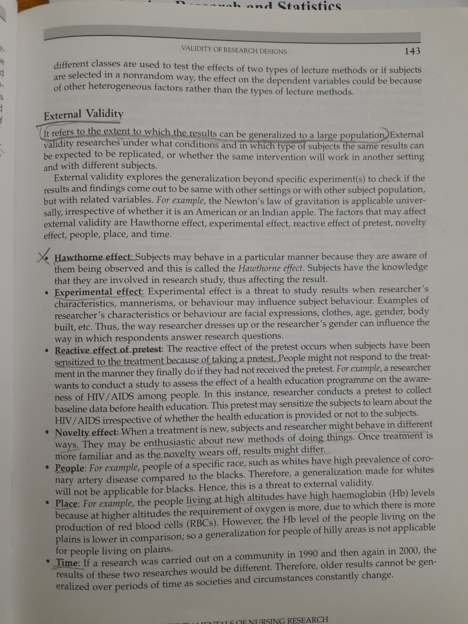 eo F, , oO 0 hu, , , , , , , , ap ww = an-enh and Ctatistics, , VALIDITY OF RESEARCH DESIGNS, SEARCH DESIGNS 143, , ifferent classes a, diff Te used to test the effects of two types of lecture methods or if subjects, , re selected in a nonr, z a eee aie may, the effect on the dependent variables could be because, actors rather than the types of lecture methods., , External Validity, , Ge,, Ucrefges tothe catent.te which the results can be generalized to a large population) External, , i ots venice nen and in which type of subjects the same results can, 4 , ot Whether the same inte i i i i, Bie fi different subjects, a intervention will work in another setting, , es ed explores the generalization beyond specific experiment(s) to check if the, resu ? DR come out to be same with other settings or with other subject population,, but wi re ate variables. For example, the Newton’s law of gravitation is applicable universally, irrespective of whether it is an American or an Indian apple. The factors that may affect, , external validity are Hawthorne effect, experimental effect, reactive effect of pretest, novelty, effect, people, place, and time., , e Hawthorne effect: Subjects may behave ina particular manner because they are aware of, them being observed and this is called the Hawthorne effect. Subjects have the knowledge, that they are involved in research study, thus affecting the result., , ° xperimental effect: Experimental effect is a threat to study results when researcher’s, characteristics, mannerisms, or behaviour may influence subject behaviour. Examples of, researcher’s characteristics or behaviour are facial expressions, clothes, age, gender, body, built, etc. Thus, the way researcher dresses up or the researcher’s gender can influence the, way in which respondents answer research questions., , ° Reactive effect of pretest: The reactive effect of the pretest occurs when subjects have been, sensitized to the treatment because of taking.a pretest. People might not respond to the treatment in the manner they finally do if they had not received the pretest. For example, a researcher, wants to conduct a study to assess the effect of a health education programme on the awareness of HIV/AIDS among people. In this instance, researcher conducts a pretest to collect, baseline data before health education. This pretest may sensitize the subjects to learn about the, HIV/AIDS irrespective of whether the health education is provided or not to the subjects., , ° Novelty effect: When a treatment is new, subjects and researcher might behave in different, ways. They may be enthusiastic about new methods of doing things. Once treatment is, more familiar and as the novelty wears off, results might differ., , ° People: For example, people of a specific race, such as whites have high prevalence of coronary artery disease compared to the blacks. Therefore, a generalization made for whites, will not be applicable for blacks. Hence, this is a threat to external validity. —, , © Place: For example, the people living at high altitudes have high haemoglobin (Hb) levels, because at higher altitudes the requirement of oxygen is more, due to which there is more, production of red blood cells (RBCs). However, the Hb level of the people living on the, , plains is lower in comparison; so a generalization for people of hilly areas is not applicable, , = ut on a community in 1990 and then again in 2000, the, uld be different. Therefore, older results cannot be gen, f these two researches wo, | over periods of time as societies and circumstances constantly change., , a a a ALINTETRGING RESEARCH