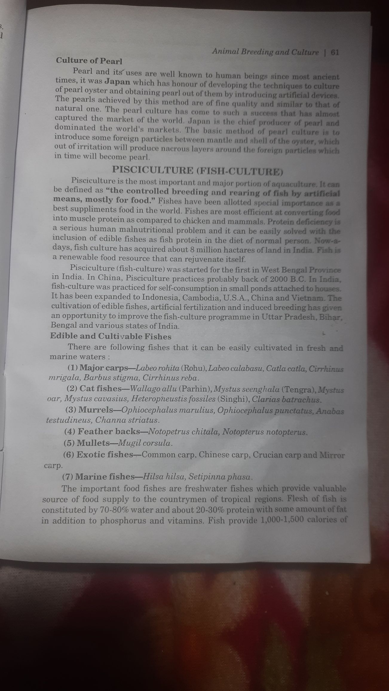 Culture of Pear], | Pearl and its“uses are well known to human beings since most ancient, times, it was Japan which has honour of developing the techniques to culture, | of pear! oyster and obtaining pearl out of them by introducing artificial deviees., The pearls achieved by this method are of fine quality and similar te that of, natural one. The pearl culture has come to such a success that has almost, captured the market of the world Japan is the chief producer of pearl and, dominated the world's market The basic method of pearl culture is te, introduce some foreign particles between mantle and shell of the oyster, whieh, , out of irritation will produce nacrous layers around the fore ign particles which, , in time will become pearl, PISCICULTURE (F, , Pisciculture is the most important, , , , SH-CULTURE), , and major portion of aquacaltare. 1t can, > defined as “the controlled breeding and rearing of fish by artifierl, means, mostly for food.” Fishes have been allotted, , be, , pecial importance as a, est suppliments food in the world. Fishes are most efficient at converting food, into muscle protein as compared to chicken and mammals, Protein deficiency is, , a serious human malnutritional problem and it can be ea sily solved with the, , inclusion of edible fishes as fish protein in the diet of normal person. Mewen=, , s, fish culture has acquired about 8 million hactares of land in India) Fiaiae, , , , a renewable food resource that can rejuvenate itself, , isciculture (fish-culture) was started for the first in West Bengal Prowimee, in India. In China, Pisciculture practices probably back of 2000 B.C. Tm Imdsa,, fish-culture was practiced for self-consumption in small ponds attached te houses, It has been expanded to Indonesia, Cambodia, U.S.A., China and Vietnam The, , cultivation of edible fishes, artificial fertilization and induced breeding has g, , , , , , , , ble Fishes, , sre are following fishes that it can be easily cultivated in fF, , marine waters, , , , , , , , fishes—Wallago allu (Parhin), Mystus seenghala (Tengra), Masts, cavasius, Heteropneustis fossiles (Singhi), Clanias batraehus:, s—Ophiocephalus marulius, Ophiocephalus punctatus, Anaoas, , s, Channa striatus., , , , , , , , , , -Notopetrus chitala, Notopterus notopterus., ts—Mugil corsula., , ishes—Common carp, Chinese carp, Crucian carp and Mirror, , (7) Marine fishes—Hilsa hilsa, Setipinna phasa,, , The important food fishes are freshwater fishes which provide valuable, source of food supply to the countrymen of tropical regions: Plesh of fish is, constituted by 70-80% water and about 20-30% protein with some amount of fat, in addition to phosphorus and vitamins. Fish provide 1,000-1,500 Calories of
