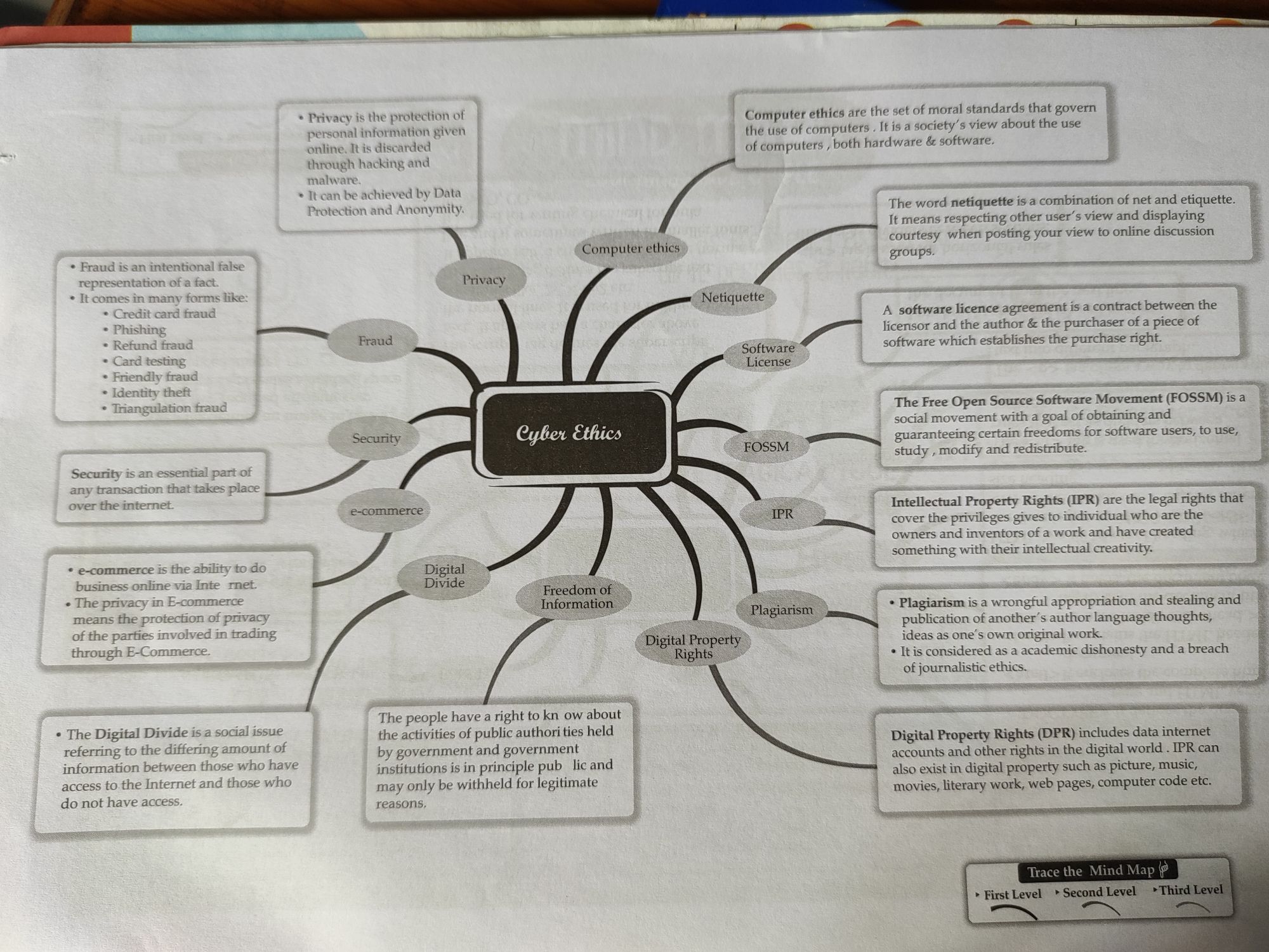 * Privacy is the protection of | Compute, , personal information given, online, It is discarded, through hacking and, malware, , * Ttcan be achieved by Data, Protection and Anonymity., , \, , Computer ethics, , , , , , , , , , , , , , , , _ Netiquette, , Software’, License, , , , * e-commerce is the ability to. do, business online via Inte met, , ¢ The privacy in Emeans the protection of p:, of the parties i, through E-C, , mamerce, , , , , , , , sania seccisslh plaaasesassnaasectte, The people have a right to kn ow about, the activities of public authorities held, by government and government, , * The Digital Divide is a social issue, referring to the differing amount of, Inigo ‘api een those who have institutions is in principle pub lic and, access to.the Internet and those who may only be withheld for legitimate, do not have access. coca, , OSE RIL, , , , , t ethics are the set of moral standards that govern, the use of computers . It is a society’s view about the use, | of computers , both hardware & software., , , , , , , , , , , , , , , , , , cached SE, The word netiquette is a combination of net and etiquette., It means respecting other user’s view and displaying, , courtesy when posting your view to online discussion, groups., , , , , , cia Aa, , , , - ae, A software licence agreement is a contract between the :, licensor and the author & the purchaser of a piece of &, software which establishes the purchase right., , , , , , , , , , The Free Open Source Software Movement (FOSSM) is a e, social movement with a goal of obtaining and ;, , = ae =, guaranteeing certain freedoms for software users, touse, ©, , study , modify and redistribute., , , , , , , Intellectual Property Rights (IPR) are the legal rights, cover the privileges gives to individual who are the, owners and inventors of a work and have created, something with their intellectual creativity., , that, , , , , , , , , , , , , , , , , , * Plagiarism is a wrongful appropriation and stealing and, publication of another’s author language thoughts,, ideas as one’s own original work., , « It is considered as a academic dishonesty and a breach, of journalistic ethics., , a s, , , , , , \,, , AMR AERA TTR ITED, , paaraasionatmuanca, , | Digital Property Rights (DPR) includes data internet, , | accounts and other rights in the digital world . IPR can, also exist in digital property such as picture, music,, , movies, literary work, web pages, computer code etc.