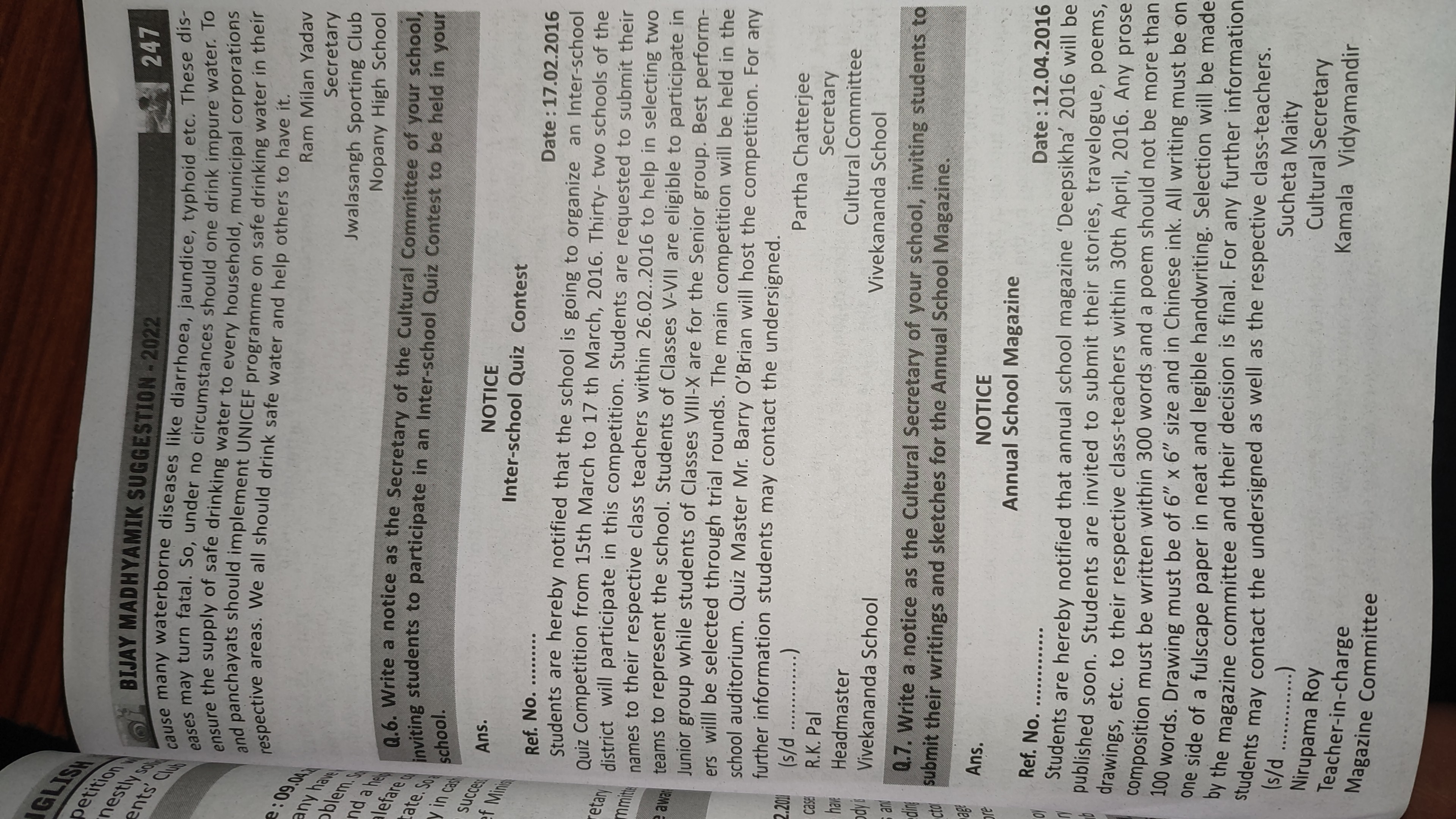 estly so, HST7, ents Club, petition, 247, BIJAY MADHYAMIK SUGGESTION-2022, d panchayats should implement UNICEF programme on safe drinking water in their, Ram Milan Yadav, Secretary, Jwalasangh Sporting Club, Nopany High School, blem.s, nviting students to participate in an Inter-school Quiz Contest to be held in your, ate. So, lefare, 0 6. Write a notice as the Secretary of the Cultural Committee of your school,, school., NOTICE, Ans., of Minis, Inter-school Quiz Contest, Date:17.02.2016, Ref. No., Students are hereby notified that the school is going to organize an Inter-school, Quiz Competition from 15th March to 17 th March, 2016. Thirty- two schools of the, retary, district will participate in this competition. Students are requested to submit their, names to their respective class teachers within 26.02..2016 to help in selecting two, teams to represent the school. Students of Classes V-VIl are eligible to participate in, Junior group while students of Classes VIII-X are for the Senior group. Best perform-, e awa, ers willl be selected through trial rounds. The main competition will be held in the, school auditorium. Quiz Master Mr. Barry O'Brian will host the competition. For any, further information students may contact the undersigned., 2.200 (s/d . ..), Partha Chatterjee, Secretary, Cultural Committee, R.K. Pal, hav, Vivekananda School, Mey, dys Vivekananda School, Headmaster, Q.7. Write a notice as the Cultural Secretary of your school, inviting students to, submit their writings and sketches for the Annual School Magazine., NOTICE, Ans., Annual School Magazine, Date :12.04.2016, Students are hereby notified that annual school magazine 'Deepsikha' 2016 will be, published soon. Students are invited to submit their stories, travelogue, poems,, drawings, etc. to their respective class-teachers within 30th April, 2016. Any prose, composition must be written within 300 words and a poem should not be more than, 100 words. Drawing must be of 6" x 6" size and in Chinese ink. All writing must be on, une side of a fulscape paper in neat and legible handwriting. Selection will be made, oy the magazine committee and their decision is final. For any further information, Students may contact the undersigned as well as the respective class-teachers., (s/d .. .), Nirupama Roy, Teacher-in-charge, Ref. No., ..., Sucheta Maity, Cultural Secretary, Kamala Vidyamandir, Magazine Committee