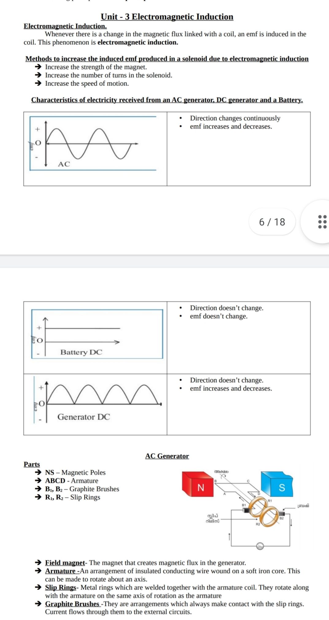 Unit - 3 Electromagnetic Induction, , Whenever there is a change in the magnetic flux linked with a coil, an emf is induced in the, coil. This phenomenon is electromagnetic induction., , M in in mf in lenoi I mi ic in ion, > Increase the strength of the magnet., > Increase the number of turns in the solenoid., > Increase the speed of motion., , cl istics of electrici ived fi AC pc iaB, , * Direction changes continuously, * emf increases and decreases., , , , AC, , , , , , , , , , 6/18, , , , , , * Direction doesn’t change., * emf doesn’t change., , , , , , , , , , , , , , a Battery DC, * Direction doesn’t change., SE * emf increases and decreases., O, a Generator DC, A ni rr, Parts, , > NS - Magnetic Poles, , > ABCD - Armature, , > B,, B,- Graphite Brushes, > R,, R2- Slip Rings, , , , , , , , , , > Field magnet- The magnet that creates magnetic flux in the generator., , > Armature -An arrangement of insulated conducting wire wound on a soft iron core. This, can be made to rotate about an axis., , > Slip Rings- Metal rings which are welded together with the armature coil. They rotate along, with the armature on the same axis of rotation as the armature, , > Graphite Brushes -They are arrangements which always make contact with the slip rings., Current flows through them to the external circuits.