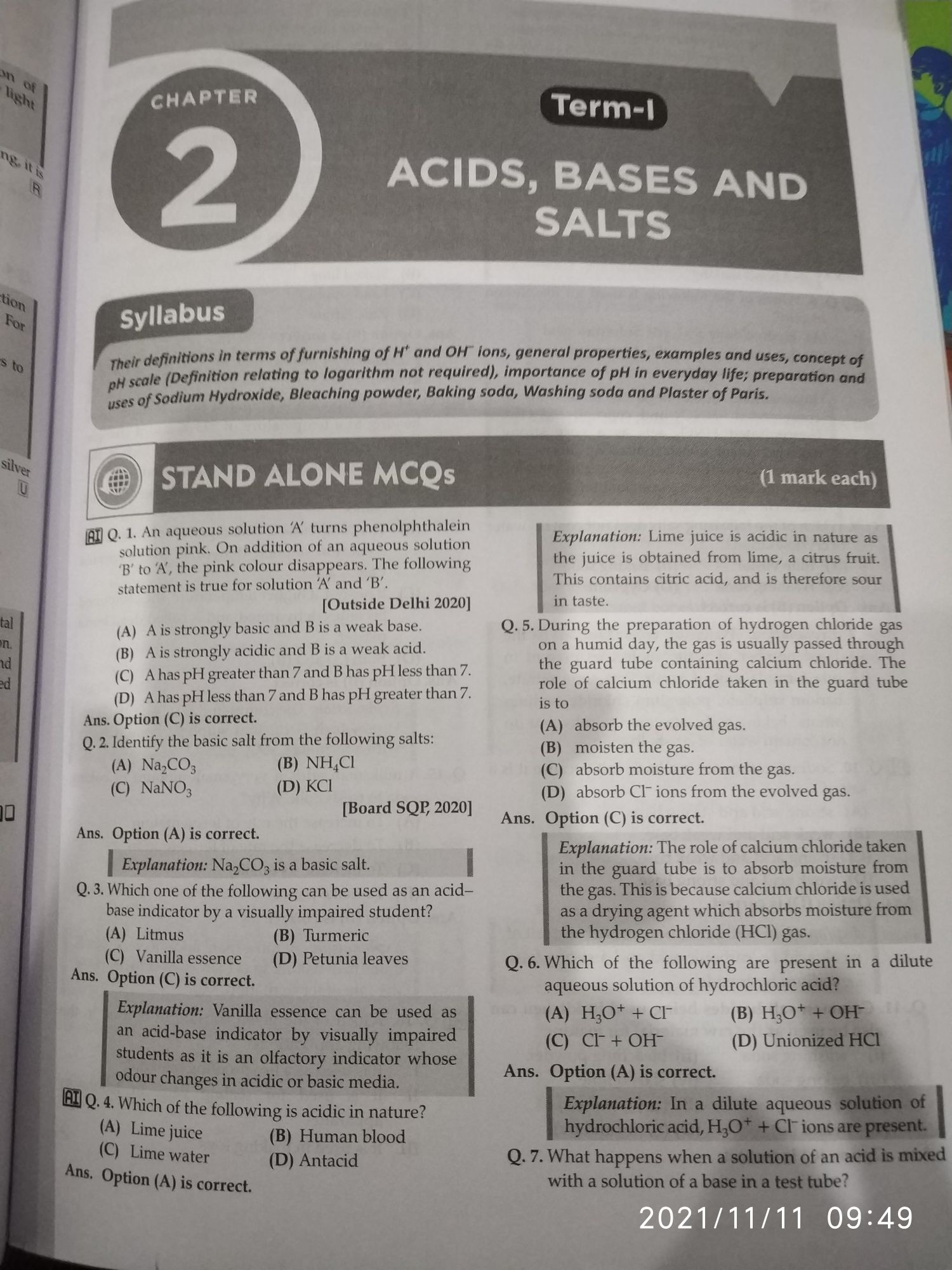 ACIDS, BASES AND, SALTS, , , , Their defi, , pH scale (Definition relating to logarithm not required), importance of pH in everyday life; preparation and, yses of Sodium Hydroxide, Bleaching powder, Baking soda, Washing soda and Plaster of Paris., , STAND ALONE MCQs, , Q. 1, An aqueous solution ‘A’ turns phenolphthalein, solution pink, On addition of an aqueous solution, B’ to ‘A, the pink colour disappears. The following, statement is true for solution ‘A and ‘B’., [Outside Delhi 2020], (A) Ais strongly basic and B is a weak base., (B) Ais strongly acidic and B is a weak acid., (©) Ahas pH greater than 7 and B has pH less than 7., (D) Ahas pH less than 7 and B has pH greater than 7., Ans. Option (C) is correct., Q.2. Identify the basic salt from the following salts:, (A) Na,CO, (B) NH,Cl, (©) NaNO, (D) KCl, [Board SQP 2020], , , , Ans. Option (A) is correct., , | Explanation: Na,CO; is a basic salt. 1, Q.3. Which one of the following can be used as an acid—, base indicator by a visually impaired student?, (A) Litmus (B) Turmeric, (C) Vanillaessence _ (D) Petunia leaves, Ans. Option (C) is correct., , ., , , , , Q. 4. Which of the eiewin is acidic i, , in nature?, (A) Lime j ‘, (©) Lime water, , , , nitions In terms of furnishing of H' and OH ions, general properties, examples and uses, concept of, , , , , , , Term-|, , a, , , , , , (1 mark each), , Explanation: Lime juice is acidic in nature as, the juice is obtained from lime, a citrus fruit., This contains citric acid, and is therefore sour, in taste., , Q.5. During the preparation of hydrogen chloride gas, , on a humid day, the gas is usually passed through, the guard tube containing calcium chloride. The, role of calcium chloride taken in the guard tube, is to, , (A) absorb the evolved gas., , (B) moisten the gas., , (C) absorb moisture from the gas., , (D) absorb CI ions from the evolved gas., , Ans. Option (C) is correct., , Explanation: The role of calcium chloride taken, , in the guard tube is to absorb moisture from, , the gas. This is because calcium chloride is used, as a drying agent which absorbs moisture from, the hydrogen chloride (HCl) gas., , Q.6.Which of the following are present in a dilute, , aqueous solution of hydrochloric a, (A) H,O* + Cr (B) H,O, (€) Cl + On (D) Unioni, , , , Ans. Option (A) is correct., , , , , if an, e?, , /11/11 09:49