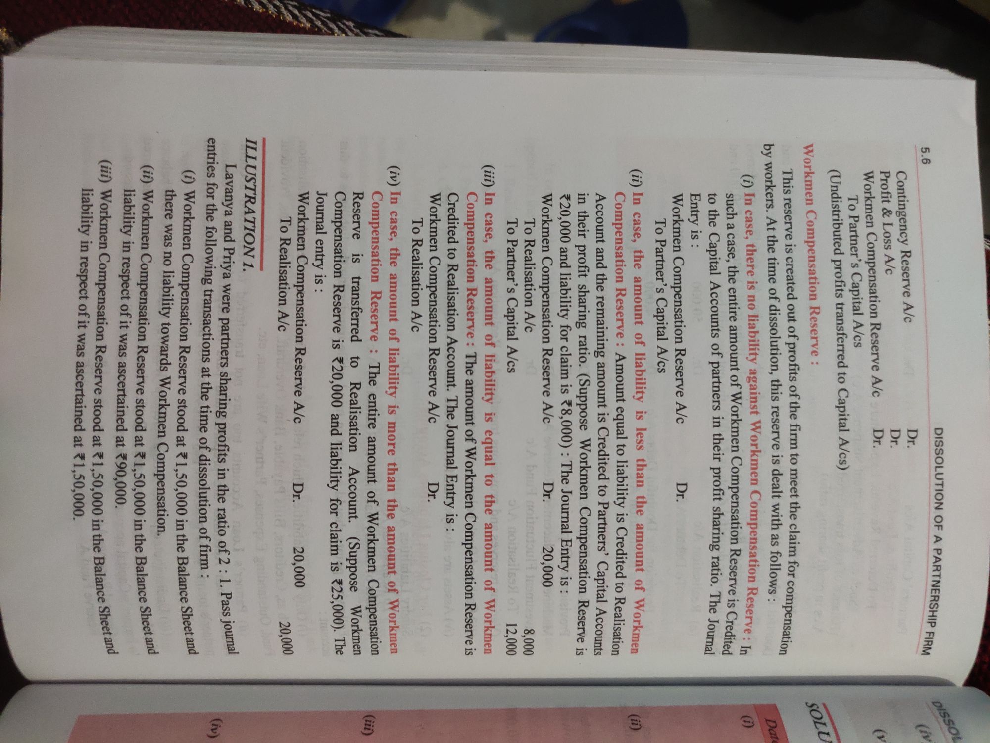DISSOLUTION OF A PARTNERSHIP FIRM, , 5.6, Contingency Reserve A/c “i, Profit & Loss A/c r., Workmen Compensation Reserve A/c Dr., , To Partner’s Capital A/cs :, (Undistributed profits transferred to Capital A/cs), , Workmen ompensation Reserve :, This reserve is created out of profits of the firm to meet the claim for Compensation, by workers. At the time of dissolution, this reserve is dealt with as follows , (i) In case, there is no liability against Workmen Compensation Reserve li, such a case, the entire amount of Workmen Compensation Reserve is Credite, to the Capital Accounts of partners in their profit sharing ratio. The Journal, Entry is :, , Workmen Compensation Reserve A/c Dr., To Partner’s Capital A/cs, (ii) In case, the amount of liability is less than the amount of Workmen, Compensation Reserve : Amount equal to liability is Credited to Realisation, Account and the remaining amount is Credited to Partners’ Capital Accounts, in their profit sharing ratio. (Suppose Workmen Compensation Reserve js, %20,000 and liability for claim is 8,000) : The Journal Entry is :, , Workmen Compensation Reserve A/c Dr. 20,000, To Realisation A/c 8,000, To Partner’s Capital A/cs 12,000, , (iii) In case, the amount of liability is equal to the amount of Workmen, Compensation Reserye : The amount of Workmen Compensation Reserve is, Credited to Realisation Account. The Journal Entry is :, , Workmen Compensation Reserve A/c Dr., To Realisation A/c, , (iv) In case, the amount of liability is more than the amount. of Workmen, Compensation Reserve : The entire amount of Workmen Compensation, Reserve is transferred to Realisation Account. (Suppose Workmen, Compensation Reserve is 20,000 and liability for claim is 25,000). The, Journal entry is :, , Workmen Compensation Reserve A/c Dr. 20,000, To Realisation A/c ane, , , , ILLUSTRATION 1., Lavanya and Priya were partners sharing profits in the ratio of 2 : 1. Pass journal, entries for the following transactions at the time of dissolution of firm :, (i) Workmen Compensation Reserve stood at 2 1,50,000 in the Balance Sheet -”, there was no liability towards Workmen Compensation., (#) Workmen Compensation Reserve stood at ¥1,50,000 in the Balance sheets!, liability in respect of it was ascertained at 90,000., (iii) Workmen Compensation Reserve stood at %1,50,000 in the Balance Sheet, liability in respect of it was ascertained at %1,50,000., , and
