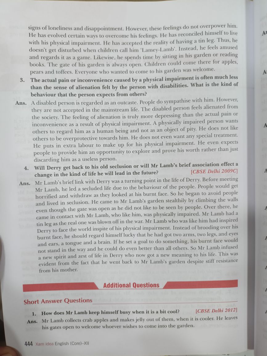 signs of loneliness and di, He has evolved certain, , appointment, However, these feelings do not overpower him,, , : 's to overcome his feelings. He has reconciled himself to live, with his physical impairment. He has accepted the reality of having a tin leg. Thus, he, doesn’t get disturbed when children call him ‘Lamey-Lamb’, Instead, he feels amused, and regards it as a game. Likewise, he spends time by sitting in his garden or reading, books. The gate of his garden is always open. Children could come there for apples,, pears and toflees, Everyone who wanted to come to his garden was welcome,, , 3. ‘The actual pain or inconvenience caused by a physical impairment is often much less, than the sense of alienation felt by the person with disabilities. What is the kind of, behaviour that the person expects from others?, , People do sympathise with him. However,, , The disabled person feels alienated from, , , , , , , , Ans. A disabled person is regarded as an outcast, they are not accepted in the mainstream Ii!, the society, The feeling of alienation is truly more depressing than the actual pain or, inconvenience as a result of physical impairment. A physically impaired person wants, others to regard him as a human being and not as an object of pity. He does not like, others to be overprotective towards him, He does not even want any special treatment, He puts in extra labour to make up for his physical impairment. He even expects, people to provide him an opportunity to explore and prove his worth rather than just, , , , , , discarding him as a useless person., 4. Will Derry get back to his old seclusion or will Mr Lamb’s brief association effect a, change in the kind of life he will lead in the future? [CBSE Delhi 2009C), ‘Ans. Mr Lamb's brief link with Derry was a turning point in the life of Derry, Before meeting, Mr Lamb, he led a secluded life due to the behaviour of the people. People would get, horrified and withdraw as they looked at his burnt face. So he began to avoid people, and lived in seclusion. He came to Mr Lamb's garden stealthily by climbing the walls, even though the gate was open as he did not like to be seen by people. Over there, he, came in contact with Mr Lamb, who like him, was physically impaired. Mr Lamb had a, tin leg as the real one was blown off in the war. Mr Lamb who was like him had inspired, Derry to face the world inspite of his physical impairment, Instead of brooding over his, burnt face, he should regard himself lucky that he had got two arms, two legs, and eyes, and ears, a tongue and a brain. If he set a goal to do something, his burnt face would, ‘not stand in the way and he could do even better than all others. So Mr Lamb infused, 4 new spirit and zest of life in Derry who now got a new meaning to his life. Thhis was, evident from the fact that he went back to Mr Lamb's garden despite stiff resistance, , from his mother., , ED 1 6cit0n2 Questions, , ‘Short Answer Questions, , _ How does Mr Lamb keep himself busy when it is a bit cool? [CBSE Delhi 20121, ‘Mr Lamb collects crab apples and makes jelly out of them, when itis cooler. He leaves, “his gates open to welcome whoever wishes to come into the garden., , , , , , | English (Core)-Xi