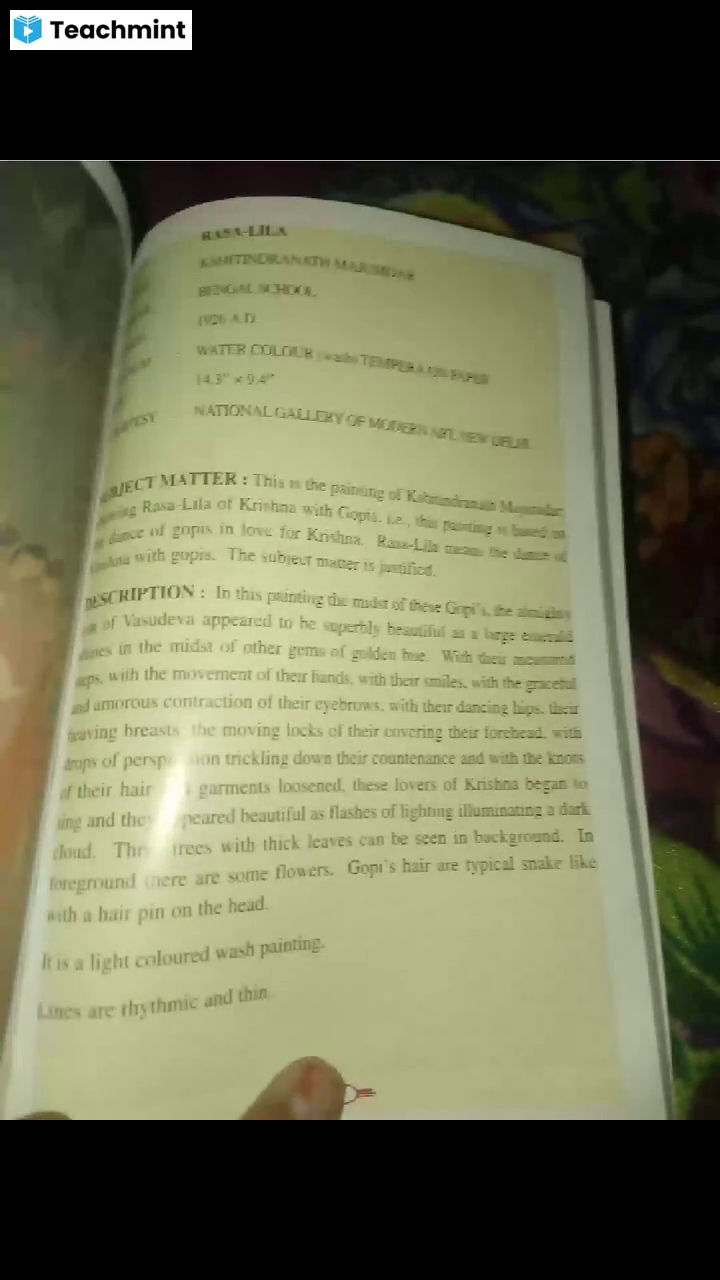 PAINTING (THEORY), (HISTORY OF INDIAN ART), , Time allowed : 2 hours (2019) Maximum Marks : 49, , General Instructions :, , ho, , (a) All the eight questions are compulsory, which carry equal marks., , (b) Answers to be written for question nos. 1 and 2 in about 200 words each, and for question nos. 3, 4 and 5 in about 100 words each. Question nos. 6,, 7 and 8 are objective type., , Describe the evolution of the Indian National Flag and the symbolic, , significance of the forms and colours used in its present form., , Appreciate any of the following miniature-paintings included in your course, , of study, duly based on its (i) Name of the painter/Sub-School, (11) Medium, , & technique, (iii) Subject-matter, and (iv) Composition:, , (a) Krishna Lifting Mount Govardhana (Mughal School) OR, , (b) Hazarat Nizamuddin Aulia and Amir Khusro (Deccani School), , Which are the human life-values and emotions shown in any of the, , following artworks of Contemporary (Modern) Indian Art ? Explain briefly:, , (a) The Vulture (a painting done by Kamlesh Dutt Pande) OR, , (b) Of Walls (a graphic-print done by Anupam Sud) OR, , (c) Chatturmukhi (a sculpture done by Aekka Yadagiri Rao), , Evaluate the aesthetic-grandeur of any of the following miniature-paintings, , duly based on aesthetic-parameters :, , (a) Maru-Ragini (Rajasthani School) OR, , (b) Cosmic Dance of Shiva ( Pahari School), , Identify any relevant painting included in your course of study, comprising, , of the following features and explain them in that painting accordingly :, , (a) The tendency of composing crowded scenes involving too many forms, and figures in the Mughal miniature-paintings. OR, , (b) The representation of the landscapic background with typical Deccani, hills in the Deccani miniature-paintings., , Mention the name of the artist of each of the following paintings of the, , Bengal School included in your course of study : |, , (a) Journey’s End (b) Shiva and Sati (c) Meghdoot, , (d) Arjuna Detach From War (e) Radhika, , Mention the titles of any three paintings, a graphic-print and a sculpture, , of the Contemporary (Modern) Indian Art included in your course of study, , (except those mentioned in question no. 3). j, , Mention the names of any three sub-schools of the Rajasthani School ©, , Miniature Painting and two of the Pahari School of Miniature Paiute, , included in your course of study, which you like the most., , =D