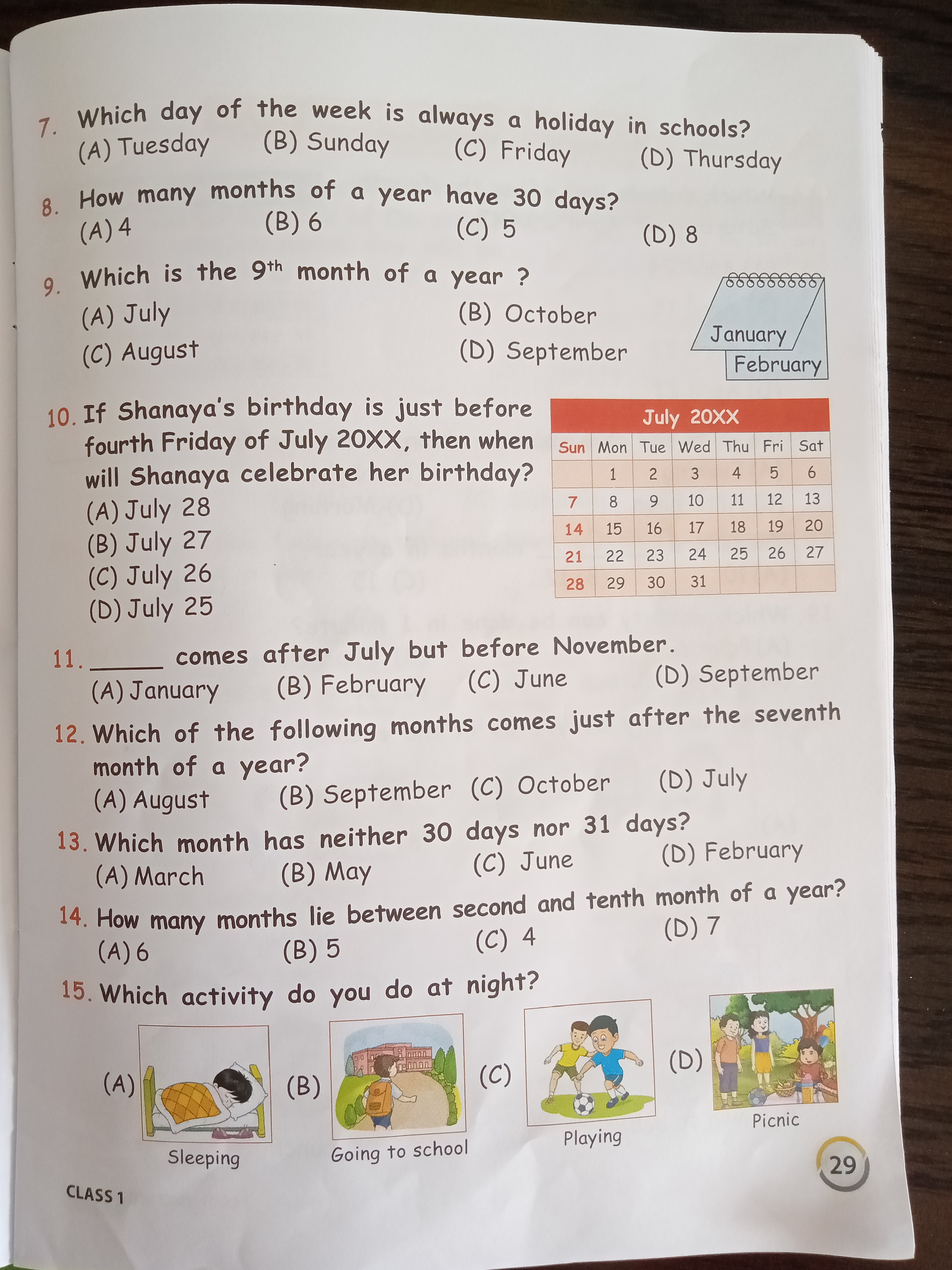 noe AN Ata Na i tata ROL UR siNi, , ies a Na i asa ce a ag CLR IS a NSE NE api ON FRE cis, , , , Which day of the week is always a holid, , (A) Tuesday (B) Sunday (C) Friday ay in schools?, , (D) Thursday, 3. How many months of a year have 30 days?, , (A) 4 (B) 6 (G@) 5 (D) 8, 9, Which is the 9 month of a year ?, , (A) July (B) October, , (C) August (D) September, , , , 10. If Shanaya’'s birthday is just before, fourth Friday of July 20XX, then when | Sun | Mon | Tue | Wed | Thu | Fri |, , , , , , , , , , , , , , , , , , will Shanaya celebrate her birthday? =§1 2 3 +4 5 6 |, , (A) July 28 care oe ee, , (B) July 27 | 14 | 15 | 16] 17 | 18 | 19] 20), 2aeiee2 Wes) 24 Wien emmy, , 5 a B (zat 29 | 30) 31, , uly a, 11. comes after July but before November., (A) January (B) February (C) June (D) September, , 12. Which of the following months comes just after the seventh, , month of a year?, (A) August (B) September (C) October (BD) July, , 13. Which month has neither 30 days nor 31 days?, (A) March (B) May (C) June (Db) February, , 14. How many months lie between second and tenth month of a year?, (A) 6 (B) 5 (Cc) 4 (BD) 7, , 15. Which activity do you do at night?, , , , (A), , , , CLASS 1