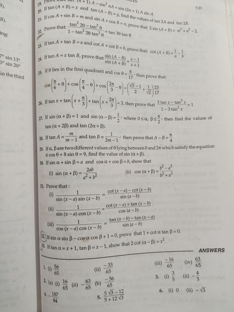 *, , 3)., B),, ing:, , sin 139, ° sin 29, , in the thing, , , , eee, tan (A +B) =, , Fae bd a, Fand tan(4 py Qn+1)4 4, yy, 108 A + sin B= m A, , , , , , , , , , , , , , =, fing, Me the Vales of tan 3.4 id, fan 2A and tan 28, Prove, that 2 sin (A +B) = m2, tan 30 tan @, , , , prove that: >t, 1~tan? 26 tan? 9, , , , tan A + tan B=aand cot 4, B +00t B =b, prove, yp tan A=xt2N B, prove that SiN(A—B), sin(a+B) =;, B if 0 lies in the first quadrant and cos 0 =, NB., , abe mymtrs, , that: cot (A+B) <1 -4, ap, , , , , , , , 1, +1, , , , 8, "7 then prove that:, , , , , , 1\23, hin, Ee Qn, % wim stan(s+ 3) tnx 3 ]-3.thenprve that Stax tane, 1-3 tan’ x, y, isin (@+B)=1 and sin(a-B)=2, where 0<a, B35 then find the values of, tan (+ 2B) and tan (2+)., , 1, , , , m, 3 Iftan A=", 4 and tanB= >, then prove that A -B =, , 4, Ifo, Bare two different values of ® lying between 0 and 2n which satisfy the equation, 6c0s 0 + 8 sin 0 = 9, find the value of sin (a+)., , 30 sin o.+sin B=a and cos. + cos =D, show that, , z t Pad, @ Sn (a+ P)=-33 (i) cos a+ B=, 3, Prove that :, A a1 = cot x=) = cot (e=b), sin (xa) sin (x-b) sin (a-b), I _ cot (x =a) + tan (x= b), ate savendie—P)ininn. coe”), 1 tan (xb) = tan (e=@), (it) sin (@~b), , ih, 05 (x = a) cos (xb), , sin «sin B — cos:a. cos B+, , 10, prove that 1 + cot a.tan B=0., 4 show that 2 cot (a.- B)= A,, , 3 lttano=x +1, tan, , , , ANSWERS, TE ot 5, e ay =), 1G Ss (i 2 - “, 56 uC) eae Daeg, Xe @ z en) -8 ) ‘, 4.187 53-12 6 (i) 0 (i) -V3, 7 5. 54123