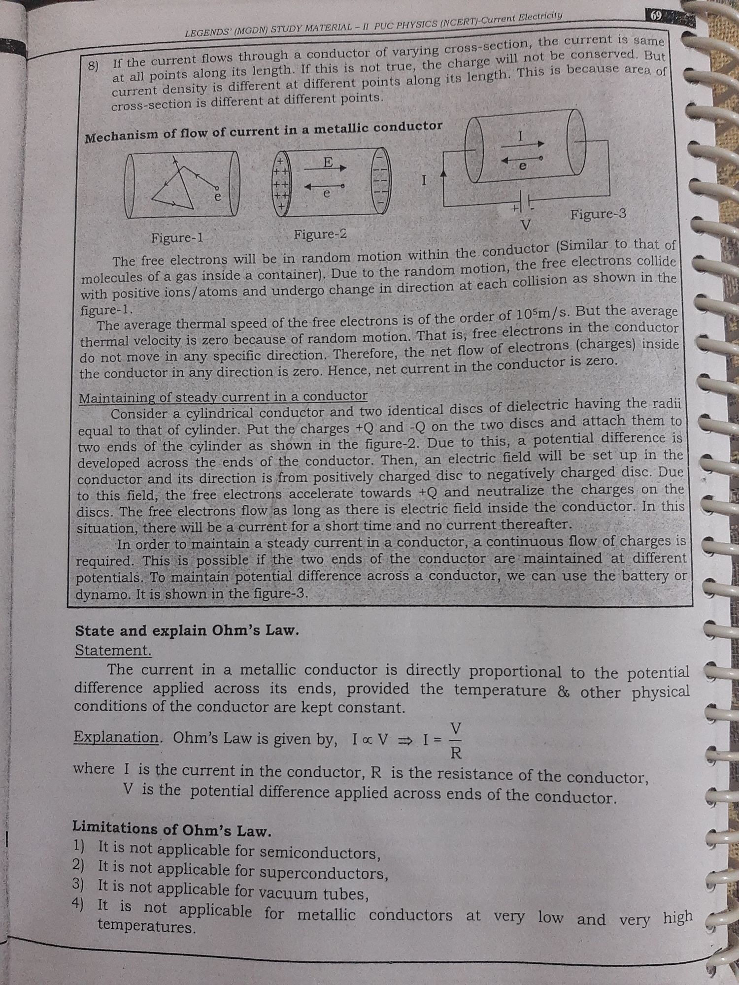 eT)-Current Electrictty, , , , , , , , , , , , , LEGENDS’ (MGDN) STUDY MATERIAL - I] PUC PHYSICS (NCE, , r ing cros, , current flows through a conductor of varying :, , 2 - a points along its length. If this is not true, the chat ah, current density is different at different points along its leng, cross-section is different at different points., , , , , , s-section, the current is same, will not be conserved. But, h. This is because area of, , , , Mechanism of flow of current in a metallic conductor, , , , , , , , , , , , , , , , , , Figure-1_ Figure-2 : See, Te ar to tha, , The free electrons will be in random motion within the Ce EE ccerons Be, , molecules of a gas inside .a container), Due to the random motion, t te Bc shown in he, , with positive ions/atoms and undergo change in direction at each collis S, , figure-1, piss, , The average thermal speed of the free electrons is of the order of 10°m/ les, , thermal velocity is zero because of random motion. That is; free electrons 1 ee ct a, , do not moye in any. specific direction, Therefore, the net flow of electrons. oy inside, the conductor in any direction is zero. Hence, net current in the conductor 1s zero., , , , , Maintaining of steady current in a conductor, , Consider a cylindrical conductor and two identi, equal to that of cylinder. Put the charges +Q and -Q on the two discs and attach them to, two ends of the cylinder as shown in the figure-2. Due to this, a potential difference is, developed across the ends of the conductor. Then, an electric field will be set up in the, conductor and its direction is from positively charged disc to negatively charged disc. Due, to this field, the free electrons accelerate towards +Q and neutralize the charges on the, discs. The free electrons flow as long as there is electric field inside the conductor. In this, situation, there will be a current for a short time and no current thereafter. y, , ‘In order’ aintain a steady current in a conductor, a continuous flow of charges is, required. Thi sible if the two ends of ‘the conductor are’maintained at different, potentials. To m tain potential difference across a conductor, we can use the battery or, dynamo. It is shown in the figure-3. Ee ae etek ete ae, , , , , , , , , , , , , , cal discs of dielectric having the radii, , Pe errr ees, , , , , >, oo, , , , , State and explain Ohm’s Law., Statement. j, , , , The current in a metallic conductor is directly proportional to the potential ¢., difference applied across its ends, provided the temperature & other physical |, conditions of the conductor are kept constant. a:, , S,, Explanation. Ohm’s Law is given by, I< V => I= x i, 5 : NS 5, where : is - current in the conductor, R is the resistance of the conductor " i, is the potential difference applied acro ¢, pp ss ends of the conductor. ws, Limitations of Ohm’s Law. e i, 7 It is not applicable for semiconductors, “&§, z It is not applicable for superconductors, e, elt 1s not applicable for vacuum tubes ey, 4) It is not ap, , licabl ;, ene € for metallic conductors at very low end very high, , 9