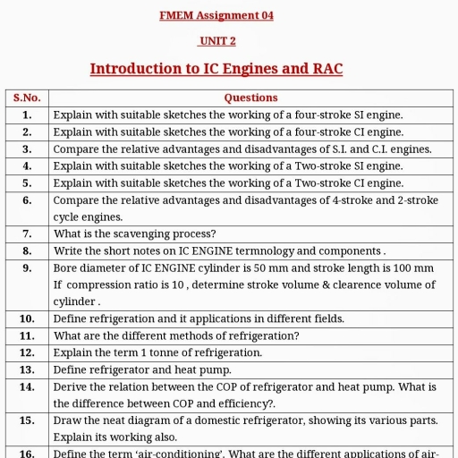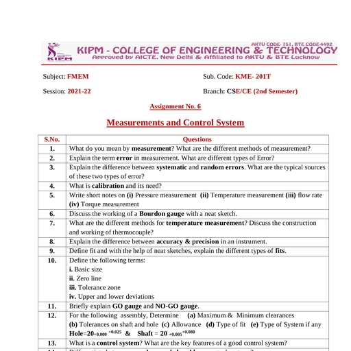 IKME-101T FUNDAMENTAL OF MECHANICAL 3L:0T:0P, , IKME-201T ENGINEERING AND MECHATRONICS, , , , , , 3 Credits, , , , , , Unit, , Topics, , Lectures, , , , I, , Unit I: Introduction to Mechanics of Solid:, , [Normal and shear Stress, strain, Hookes’ law, Poisson’s ratio, elastic, constants and their relationship, stress-strain diagram for ductile and brittle, materials, factor of safety. Basic Numerical problems., , [Types of beams under various loads, Statically Determinate Beams, Shear, force and bending moment in beams, Shear force and bending moment, diagrams, Relationships between load, shear and bending moment. Basic, Numerical problems., , , , I, , Introduction to IC Engines and RAC:, , IC Engine: Basic Components, Construction and Working of Two stroke, land four stroke SI & Cl engine, merits and demerits, scavenging process;, Introduction to electric, and hybrid electric vehicles., , Refrigeration: Its meaning and application, unit of refrigeration;, (Coefficient of performance, methods of refrigeration, construction and, working of domestic refrigerator, concept of heat pump. Formula based, numerical problems on cooling load., , Air-Conditioning: Its meaning and application, humidity, dry bulb, wet, bulb, and dew point temperatures, comfort conditions, construction and, lworking of window air conditioner., , , , ul, , Introduction to Fluid Mechanics and Applications:, , Introduction: Introduction: Fluids properties, pressure, density, dynamic, land kinematic viscosity, specific gravity, Newtonian and Non-Newtonian, fluid, Pascal’s Law, Continuity Equation, Bernaulli’s Equation and its, applications, Basic Numerical problems., , Working principles of hydraulic turbines & pumps and their classifications,, hydraulic accumulators, hydraulic lift and their applications., , , , IV, , Measurements and Control System: Concept of Measurement, Error in, measurements, Calibration, measurements of pressure, temperature, mass, flow rate, strain, force and torques; Concept of accuracy, precision and, resolution, Basic Numerical problems., , System of Geometric Limit, Fit, Tolerance and gauges, Basic Numerical, problems., , (Control System Concepts: Introduction to Control Systems, Elements of, control system, Basic of open and closed loop control with example., , , , , , Introduction to Mechatronics: Evolution, Scope, Advantages and, disadvantages of Mechatronics, Industrial applications of Mechatronics,, Introduction to autotronics, bionics, and avionics and their applications., Sensors and Transducers: Types of sensors, types of transducers and their, characteristics., , Overview of Mechanical Actuation System — Kinematic Chains, Cam,, \'rain Ratchet Mechanism, Gears and its type, Belt, Bearing,, , Hydraulic and Pneumatic Actuation Systems: Overview: Pressure, Control Valves, Cylinders, Direction Control Valves, Rotary Actuators,, , , , Accumulators, Amplifiers, and Pneumatic Sequencing Problems.