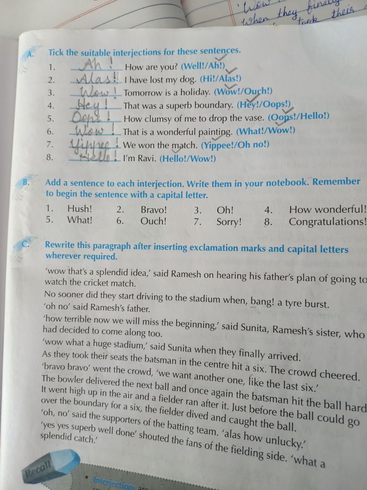 Tick the suitable interjections for these sentences., NI}, How are you? (Well!/Ah!), , ‘ one, s! Hit/Alas!), 2. wALoSE Ihave lost my dog. (Hit, 3. {lew | Tomorrow is a holiday. (Wow!/Ough!), 1s b boundary. (H¥¥1/Oops!), i That was a superb ry., * Fad ste drop the vase. (Qopst/Hello!), 5. O26 + How clumsy of me to drop tl (Qops', 6. Jud 1 That is a wonderful painting. (What!/Wow!), 7. (Uibaee | We won the match. (Yippee!/Oh no!), tt, 8. —t2Li9 | 1m Ravi. (Hello!/Wow!), , Add a sentence to each interjection. Write them in your notebook. Remember, to begin the sentence with a capital letter., , 1. Hush! 2. Bravo! 3. Oh! 4. How wonderful!, 5. What! 6. Ouch! 7. — Sorry! 8. Congratulations!, , Rewrite this paragraph after inserting exclamation marks and capital letters, wherever required., , ‘wow that’s a splendid idea,’ said Ramesh on hearing his father’s plan of going to, watch the cricket match., , No sooner did they start driving to the stadium when, bang! a tyre burst., ‘oh no! said Ramesh's father, i 4, , ‘how terrible now we will miss the beginning’ said <1: ae, had decided to come along too, ® Said Sunita, Ramesh’s sister, who, , id Sunita when they finally arrived,, man in the centre hit a si, , I, ‘We wan Fi, The bowler delivered the nes, Fas, , ee in bs air anda fielder ran after, ‘ary for a six, the fielder qi, , , a a tdi, , ‘oh, no’ said the Supporters of the battin, a a ee pl i ,, , eam. ‘ :, , . ‘all, shouted the fang ~ a aon unlucky, side, «, , ix. The crowd cheered,, ke the last six.’, , ‘yes yes superb well donar, splendid catch one