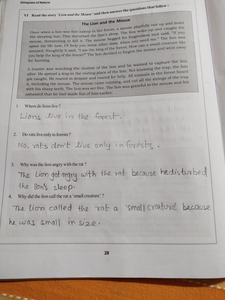 Glimpses of Nature, follow, , , , and the Mouse’, , , , , , ‘the Mouse, , , , , , , , ce |, te aie ‘The lion woke sup and cat e ), sleep. The forgiveness and said: If you, i 4 me.” The lion was, , ‘can a small creature like, wise and went away, , ~The Lion and, , , , , , , ‘Once when a tion was fast asleep in the, the sleeping lion. This disturbed the lion's, mouse, threatening to kill it, The mouse besged, spare my life now, I'll help you some ot, , amused. Haughtily it said, “I am the king of, ‘you help the king of the forest?” The lion deci, , for bunting., the lion, , wanted to capture, ig the trap, the lion, forest heard /, , tion and he, ithe lion. Not knowint, ‘All animals in the, ail the strings of the trap, ne mouse and felt, , ‘A hunter was watching the routine of the, alive. He spread a trap in the resting place o, got caught. He roared in despair and roared for help:, it, including the mouse. The mouse came running, and cut, with his sharp teeth. The lion was set free. The lion was grateful 198, , ashamed that he had made fun ofhimearlier., , , , Where do lions live?, , Lions ive in the foreslE., , 2. Do rats live only in forests ?, , No, yaks dow'E Live only in fovest, , , , 3. Why was the lion angry with the rat ?, , Tha Lion got angry with the rat because hedisturbec |, the lion's sleep:, , 4, Why did the lion call the rat a ‘small creature’ ?, \, , he lion called the ak a ‘srral| cv@tuyd becouse |, , , , he was Smal} in size> |