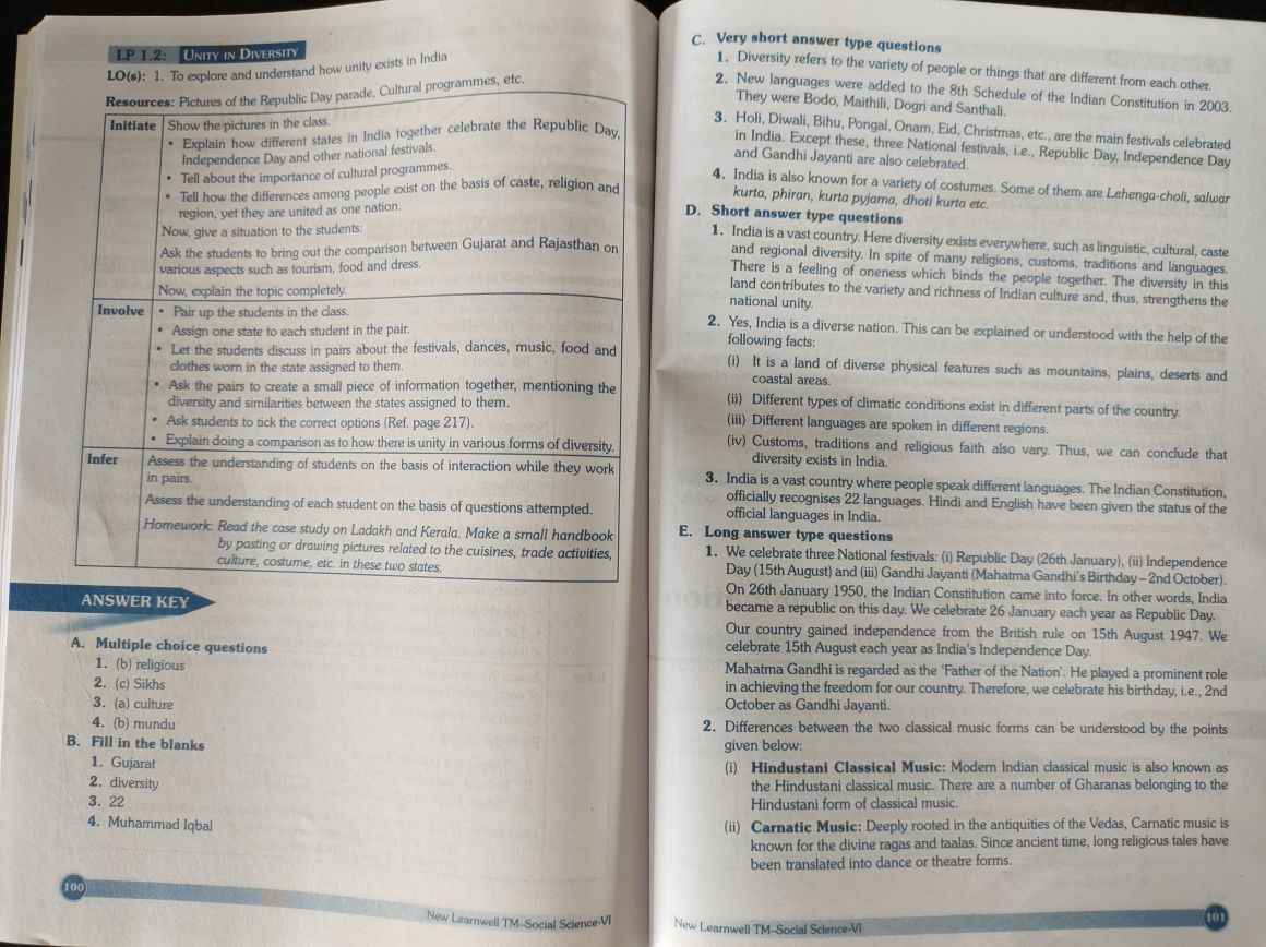 atin nda, Nanderstand how unity i!, ithe Republic Day pe", uresinthe class. jogother celebrate the Republie Day,, Gifferent states in Indl er, Sane Day and ciher national sivas, about rural programme ;, a Lhe importance exst onthe bass Of ase ilo ang, Po J Fetthow the ciferences among peor’ :, Tegon, yet they are united as one 2, i son between Gujarat and Rajasthan on,, [Ask the students to bring out the comparison, , Wvarious aspects such as tourism, food and dress., , , , , J programm, Cultural, , , , , , , , , , , , , vex, Now, explain the topic completely =, , * Pairup the students in the dass =|, # “Assign Ge state to each student in the pai, , }* Let the students discuss in pairs about the festivals, dances, musi, food and, totes wor in the state assigned to them, :, , SASK the pairs to create a small piece of information together, ‘mentioning the, iversity and similarities between the states assigned to them, :, , # Ask students to tick the correct options (Ref. page 217) q, = Explain doing 2 comparison aso how theres unity in various forms of diversi., Asses the undersianding of studens onthe bass of interaction while they work, ‘in pairs., ‘Assess the understanding ofeach stent on the basis of questions attempted, (Homework: Read the case study on Ladakh and Kerala. Make a small hane, , by posting or drawing pictues related to the cuisines, trade, Milture, costume, etc. in these t tes,, , >, , A. Multiple choice questions, 1. (b) religious, 2. (c) Sikhs, 3. (a) culture, 4. (b) mundu, B. Fill in the blanks, 1. Gujarat, 2. diversity, 3. 22, 4. Muhammad Iqbal, , Cum, , , , , , , , New Learnt TH Seal, , , , 3. Holl, Diwali, Bihu, Pongal, Onam, Eid, Chr, In India, Except these, three National fest, and Gandhi Jayanti are, , also celebrated,, 4, India is also known for a, ‘kurta, phiran, kurta pyja, , stmas, etc. are the main festivals celebrated, vals, .e., Republic Day, Independence Day, , variety of costumes. Some of them ate Lehenga-chol, salwar, ima, dhoti kurta et. seach, , D. Short answer type questions, , 1. India isa vast count, , national unity,, , 2. Yes, India isa diverse nati, , following facts;, , (i) Itis'a land of diverse, coastal areas., , ion. This can be explained or understood with the help of the, , , , , , Physical features such as mountains, plains, deserts and, , §of climatic conditions exist in different parts of the country., Ges ate spoken in different regions, , , , , , festivals: (i) Republic Day (26th January) i) Independence, Day (15th August) and (ii) Gandhi Jayanti (Mahatma Gandhi's Birthday ~2nd October),, 1950, the ition came into force. In other India, , PLS cic slices saree as, , ‘Our country gained independence from the British rule on 15th August 1947, We, , | August each year as India's Independence Day., fahatma Gandhi is regarded as the ‘Father of the Nation’ He played a prominent role, ay race ce eran, ‘October as Gandhi Jayanti, , 2. Differences between the two classical music forms can be understood by the points, given below:, , i) Hindustani Classical Music: Modem Indian classical music is also known as, , a the Hindustani classical music. There are a number of Gharanas belonging to the, i z rte of the Vedas, Carnatic music is, Carnatic Music: Deeply rooted in the antiquities of the, , (ii) icnown forthe divine raga and tals Since ancien ime, long religious tales have, been translated into dance or theatre forms.