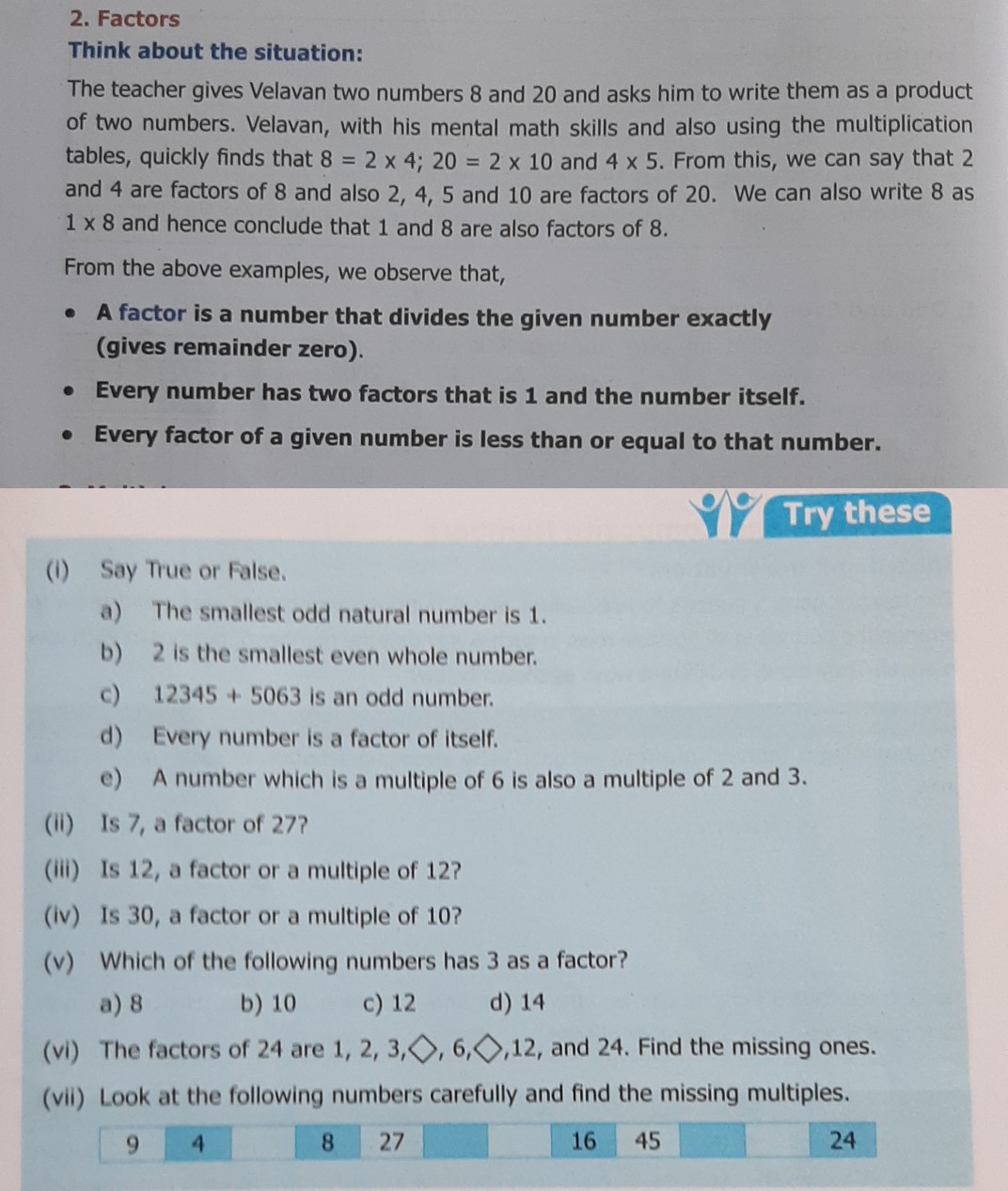 2. Factors, Think about the situation:, , The teacher gives Velavan two numbers 8 and 20 and asks him to write them as a product, of two numbers. Velavan, with his mental math skills and also using the multiplication, tables, quickly finds that 8 = 2 x 4; 20 = 2 x 10 and 4 x 5. From this, we can say that 2, and 4 are factors of 8 and also 2, 4, 5 and 10 are factors of 20. We can also write 8 as, 1 x 8 and hence conclude that 1 and 8 are also factors of 8., , From the above examples, we observe that,, , e A factor is a number that divides the given number exactly, (gives remainder zero)., , e Every number has two factors that is 1 and the number itself., e Every factor of a given number is less than or equal to that number., , v7 ooo, , (i) Say True or False,, 4) The smallest odd natural number is 4., b) 2 Is the smallest even whole number., €) 12345 + 5063 Is an odd number., d) Every number is a factor of itself,, e) A number which is a multiple of 6 is also a multiple of 2 and 3., (ii) Is 7, a factor of 27?, (ili) Is 12, @ factor or a multiple of 12?, (iv) Is 30, a factor or a multiple of 10?, (vy) Which of the following numbers has 3 as a factor?, a)8 b) 10 c) 12 d) 14, (vi) The factors of 24 are 1, 2, 3,©, 6,©,12, and 24. Find the missing ones., , (vii) Look at the following numbers carefully and find the missing multiples., , (7 mv rs