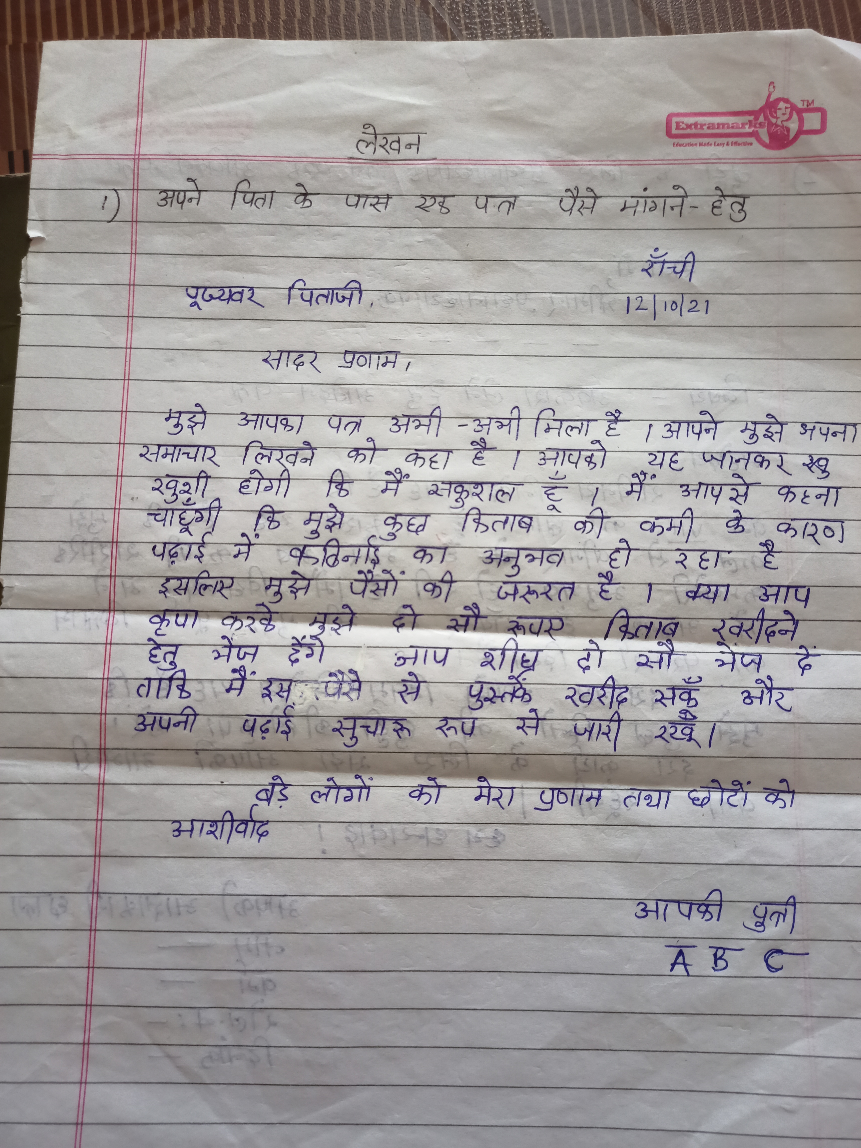 पिता के पास एक पत्र पैसे मांगने हेतु