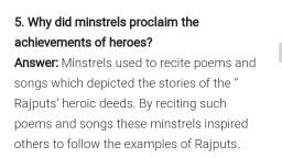 (History)(Chapter - 9) (The Making of Regional Cultures), , (Cisse), ,, , Let's discuss, , Question 5:, , Why did minstrels proclaim the achievements of heroes?, , € Answer 5:, , The minstrels proclaimed the achievements of heroes in order to:, > Preserve their memories., > Inspire other to follow their example., , Question 6:, , Why do we know much more about the cultural practices of rulers than about those of ordinary, people?, , € Answer 6:, , Rulers adopted many methods to preserve their achievements, such as, minstrels singing their heroic, stories, paintings inscriptions, historical worth, donation to temples, etc, while ordinary people did, not do anything to preserve the records of their heroic deeds. Therefore, we know more about the, cultural practices of rulers than about those of ordinary people., , , , , , Question 7:, Why did conquerors try to control the temple of Jagannatha at Puri?, , € Answer 7:, , Conquers tried to gain control over the Jagannatha temple at Puri because it would make their rule, acceptable to the local people since the temple was important as a place of pilgrimage and was a, center of authority in social and poli, , , , , , Question 8:, Why were temples built in Bengal?, € Answer 8:, , The temple builders of Bengal wanted to demonstrate their power and proclaim their piety., Therefore, they built temples., , Let's do, Question 9:, Describe the most important features of the culture of your region, focusing on buildings, performing, arts and painting., € Answer 9:, Students, do it yourselves., [Hint: Take Delhi for example:, » Architecture of Delhi presents old as well as new buildings such as Red Fort, Qutub Minar,, Parliament House, India Gate, etc., > Delhi in the centre ofall types of arts such as dances, plays, poetry sessions, etc., > All types of paintings are found and done in Delhi.]