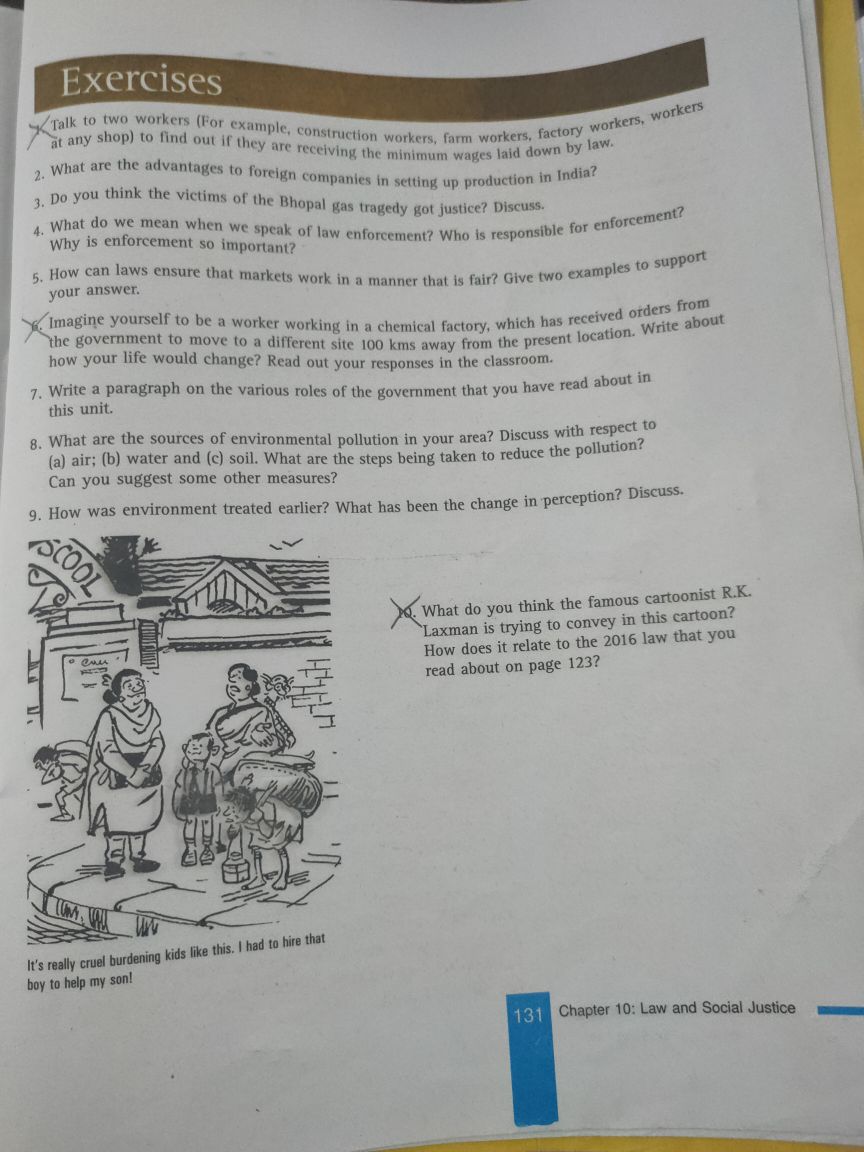 Zialk to two workers (For, 4 kers (For example,, shop) to find out if iherin cs wom, , at an const, onstruction, J workers, farm workers, factory Wor, , are receiv, ing the minimum wages laid down by TW:, , , , 2, What are the advantage, ia?, , S to fore, an, ,_ Do you think the victims of th Companies in seting up production in Ind, of the Bhopal, fas traged!, y ot justice? Discuss., , 4, What do we mean wher, ‘| si nN We spea, why is enforcement so oon law enforcement? Who is responsible for ©, , forcement?, , 5, How can laws ensure, , 6 that mark, , your answer. ets work in a manner that is fair? Give two examples 0 support, yea ofders from, , \Cimagine yourself to b, , r © 8 worke, ine GEIST wketag eat iron eck noes spree, a differs ., how your life would change? Read out your eopecees i the lass present location. Write about, , : your responses in the classroom., , 7, Write a paragraph on the vari spec, , . eval, , pee rious roles of the government that you have read about 1", iscuss with respect t0, , 8. What are the ,, sources of environmental pollution in your area? Di, duce the pollution?, , (a) air; (b) water and (c) soil. What are the steps being taken to re, , Can you suggest some other measures?, ception? Discuss, 9, How was environment treated earlier? What has been the change in Pere, , famous cartoonist R-Key in this cartoon?, 1016 law that you, , ‘What do you think the, ‘Laxman is trying to conv, How does it relate to the 21, read about on page 123?, , , , I's relly cruel burdening Kis, boy to help my son!, , , , Chapter 10: Law and Social Justice mms