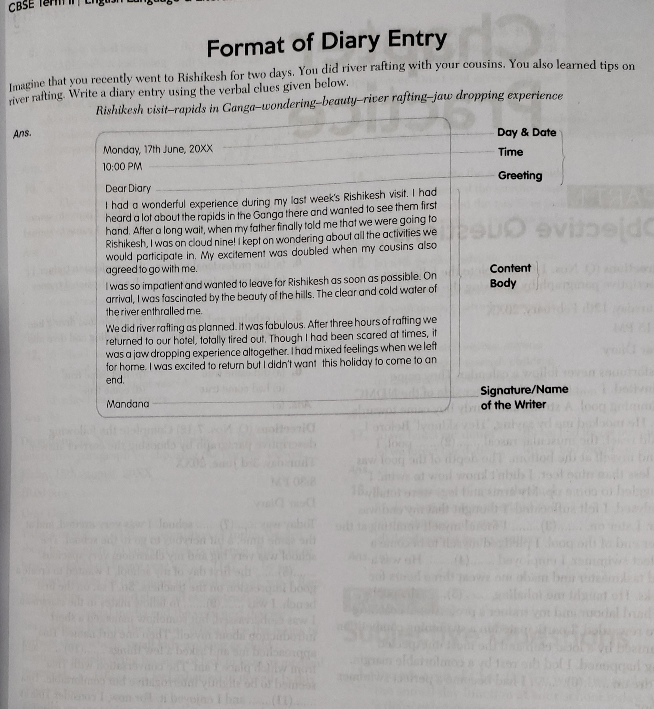 CBSE GROG AMOR: fo See eS Sn ae ne Gee Se, , Format of Diary Entry, , that you recently went to Rishikesh for two days. You did river rafting with your cousins. You also learned tips on, , [magine ! 3, river ratting. Write a diary entry using the verbal clues given below., Rishikesh visit-rapids in Ganga-wondering-beauty—river rafting—jaw dropping experience, , Ans. Li, , Monday, 17th June, 20XX Day & Date, , 10:00 PM Time, , Dear Diary es cresting, , st week's Rishikesh visit. | had, , | had a wonderful experience during my la, heard a lot about the rapids in the Ganga there and wanted to see them first, hand. After a long wait, when my father finally told me that we were goingfo |, Rishikesh, | was on cloud nine! | kept on wondering about all the activitieswe | |, would participate in. My excitement was doubled when my cousins also, agreed to go with me., | was so impatient and wanted to leave for Rishikesh as soon as possible. On Content, arrival, | was fascinated by the beauty of the hills. The clearand cold water of | | Body, the river enthralled me., We did river rafting as planned. It was fabulous. After three hours of rafting we, returned to our hotel, totally tired out. Though | had been scared at times, it, was a jaw dropping experience altogether. | had mixed feelings when we left, arene | was excited to return but | didn’t want this holiday to come toan, end., | Mandana Signature/Name, of the Writer