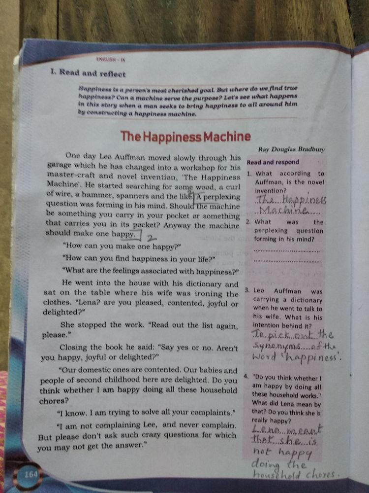 1, Read and reflect, , , , Nappiness tx a perwon's moat cheriahedt goal, But where do we find true, ‘Aanpinesa? Cun a machine serve the purpose? Let's see what happens, tm Ohis story when a man seeks to bring happiness to all around him, , Ay constructing a happiness machine,, , The Happiness Machine, , One day Leo Auffman moved slowly through his, ‘Barge Which he has changed into a workshop for his., master-craft and novel invention, ‘The Happines, Machine’, He started searching for ier ac, , , , , , of wire, a hammer, spanners and the ike)A perplexing, question was forming in his mind. Should the machine, be something you carry in your pocket or something, that carries you in its pocket? Anyway the machine, should make one happy. | 2, , “How can you make one happy?", , , , , , , , “How can you find happiness in your life?”, “What are the feelings associated with happiness?", He went into the house with his dictionary and, sat on the table where his wife was ironing the, clothes, “Lena? are you pleased, contented, joyful or, delighted?”, , She stopped the work. “Read out the list again,, , please.”, , Closing the book he said: “Say yes or no. Aren't, you happy, joyful or delighted?”, , “Our domestic ones are contented, Our babies and, people of second chilthood here are delighted, Do you, think whether I am happy doing all these household, chores?, , “[ know, I am trying to solve all your complaints,”, , [am not complaining Lee, and never complain,, But please don't ask such oreny. questions for which, you may not get the answer,, , , , "Do you think whether |, , Ray Douglas Bradbury, , jad and respond, , 1, What according to, Auffman, Is the novel, invention? ,, , , , What was the, , perplexing question, forming in his mind?, , , , Leo Auffman was, , carrying a dictionary, when he went to talk to, his wife, What Is his, intention behind it?, , Fntddinkath, , , , , , , , am happy by doing all, these household works.’, ‘What did Lena mean by, that? Do you think she Is, really happy?