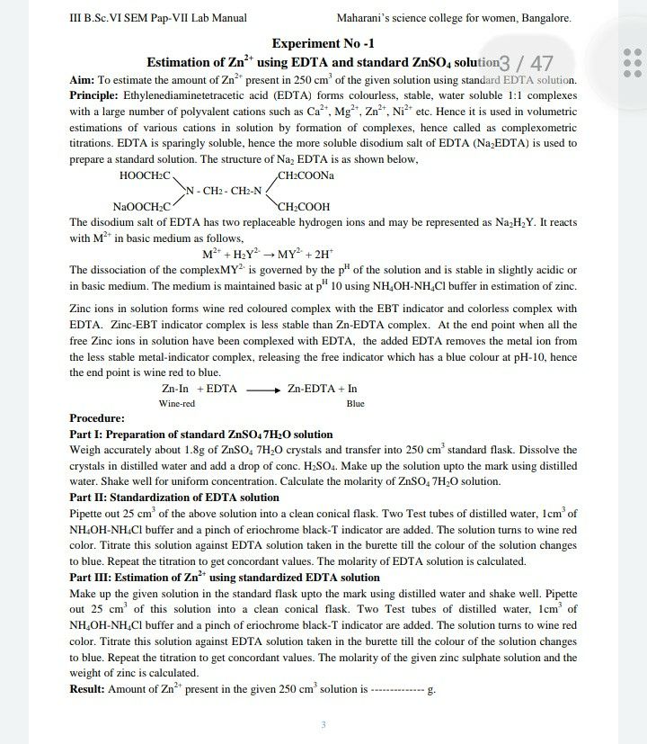 IIIB Se.VI SEM Pap-VII Lab Manual Maharani’s science college for women, Bangalore., , Experiment No -1, Estimation of Zn™* using EDTA and standard ZnSO, solution / 47, ‘Aim: To estimate the amount of Zn™ present in 250 cm’ of the given solution using standard EDT solution., Principle: Ethylenediaminetetracetic acid (EDTA) forms colourless, stable, water soluble 1:1 complexes, with a large number of polyvalent cations such as Ca°*, Mg", Zn, Ni? ete. Hence itis used in volumetric, estimations of various cations in solution by formation of complexes, hence called as complexometric, titrations. EDTA is sparingly soluble, hence the more soluble disodium salt of EDTA (NasEDTA) is used to, prepare a standard solution. The structure of Na; EDTA is as shown below,, CH:COONa, sen C, "HCOOH, ‘The disodium salt of EDTA has two replaceable hydrogen ions and may be represented as NasH.Y. It reacts,, with M?* in basic medium as follows,, M+ Hay? MY? + 2H", ‘The dissociation of the complexMY" is governed by the p! of the solution and is stable in slightly acidic or, in basic medium. The medium is maintained basic at p"" 10 using NH,OH-NH,C! buffer in estimation of zinc., , , , , , , , Zinc ions in solution forms wine red coloured complex with the EBT indicator and colorless complex with, EDTA. Zinc-EBT indicator complex is less stable than Zn-EDTA complex. At the end point when all the, free Zinc ions in solution have been complexed with EDTA, the added EDTA removes the meta ion from, the less stable metalindicator complex, releasing the free indicator which has a blue colour at pH-10, hence, the end point is wine red to blue., , ZnIn +EDTA ——» Zn-EDTA+In, , Wine Be, Procedure:, Part I: Preparation of standard ZnSO, 7H0 solution, Weigh accurately about 1.8g of ZnSO, 7H,O crystals and transfer into 250 cm’ standard flask. Dissolve the, crystals in distilled water and add a drop of conc. H:SOs. Make up the solution upto the mark using distilled, water. Shake well for uniform concentration. Calculate the molarity of ZnSO, 7H;0 solution, Part II: Standardization of EDTA solution, Pipette out 25 cm’ of the above solution into a clean conical flask. Two Test tubes of distilled water, Lem’ of, NHLOH-NH.CI buffer and a pinch of eriochrome black-T indicator are added. The solution turns to wine red, color. Titrate this solution against EDTA solution taken in the burette till the colour of the solution changes, to blue. Repeat the titration to get concordant values. The molarity of EDTA solution is calculated,, Part III: Estimation of Zn” using standardized EDTA solution, Make up the given solution in the standard flask upto the mark using distilled water and shake well, Pipette, out 25 cm’ of this solution into a clean conical flask. Two Test tubes of distilled water, Lem’ of, NHLOH-NH,CI buffer and a pinch of eriochrome black: indicator are added. The solution turns to wine red, color. Titrate this solution against EDTA solution taken in the burette till the colour of the solution changes, to blue. Repeat the titration to get concordant values. The molarity ofthe given zinc sulphate solution and the, weight of zinc is calculated., Result: Amount of Zn” present in the given 250 em solution is