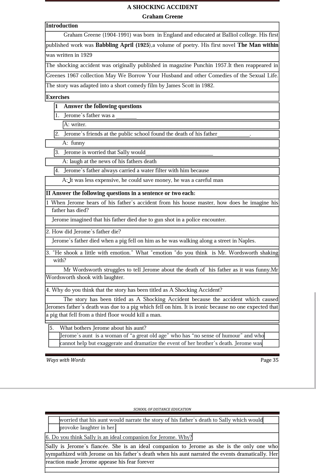A SHOCKING ACCIDENT, Graham Greene, , , , Introduction, Graham Greene (1904-1991) was born in England and educated at Balliol college. His first|, , , , , , published work was Babbling April (1925),a volume of poetry. His first novel The Man within|, , , , }was written in 1929, , , , The shocking accident was originally published in magazine Punchin 1957.It then reappeared in, , , , Greenes 1967 collection May We Borrow Your Husband and other Comedies of the Sexual Life., , , , |The story was adapted into a short comedy film by James Scott in 1982, , , , Exercises, 1 Answer the following questions, , , , , , , , , , 1. Jerome’s father was a, , , , , , |A: writer., 2. Jerome’s friends at the public school found the death of his father, , , , , , , , , , , , ‘A: funny, , , , , , 3. Jerome is worried that Sally would, , A: laugh at the news of his fathers death, , , , , , , , , , 4. Jerome’s father always carried a water filter with him because, , , , , , , , A; It was less expensive, he could save money, he was a careful man, , , , , , II Answer the following questions in a sentence or two each:, 1 When Jerome hears of his father’s accident from his house master, how does he imagine his, father has died?, , Jerome imagined that his father died due to gun shot in a police encounter., , , , , , , , , , , , 2. How did Jerome's father die?, Jerome's father died when a pig fell on him as he was walking along a street in Naples., , , , , , , , 3. "He shook a little with emotion.” What "emotion "do you think is Mr. Wordsworth shaking}, with?, , Mr Wordsworth struggles to tell Jerome about the death of his father as it was funny.Mr|, |Wordsworth shook with laughter., , , , , , , , , , , , 4. Why do you think that the story has been titled as A Shocking Accident?, , The story has been titled as A Shocking Accident because the accident which caused, [Jeromes father’s death was due to a pig which fell on him, It is ironic because no one expected that, , fa pig that fell from a third floor would kill a man., , , , , , , , , , , , , , , , 5. What bothers Jerome about his aunt?, jerome’s aunt is a woman of “a great old age” who has “no sense of humour” and wh, ‘annot help but exaggerate and dramatize the event of her brother's death, Jerome way, , SS, Ways with Words Page 35, , , , , , , , , , , , , , SCHOOL OF DISTANCE EDUCATION, , , , , , orried that his aunt would narrate the story of his father’s death to Sally which would|, , , , , , , , , , provoke laughter in her], , , , , , 6. Do you think Sally is an ideal companion for Jerome. Why?|, , Sally is Jerome's fiancée. She is an ideal companion to Jerome as she is the only one who, sympathized with Jerome on his father’s death when his aunt narrated the events dramatically. Her, , , , , , , , , , reaction made Jerome appease his fear forever