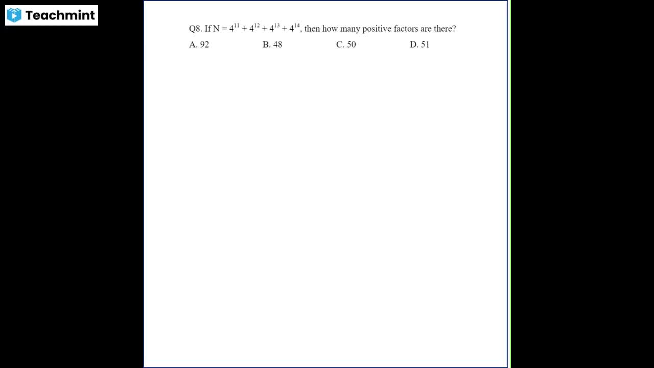 i repeating a three digit number; for, ; example, 235, 235 or 718, 718 etc. Any, i number of this form is always exactly, ; divisible by:, i (1) 8 only, (3) 12 only, , (2) 11 only, (4) 1001, , i i Q2. A number when divided by 6 leaves, i jremainder 4. When the square of the, ' same number is divided by 6, the, i remainder is:, , i qd)1 (2)2, , i Q3. If two numbers are each divided by, i the same divisor, the remainders are, i respectively 2 and 3. If the sum of the, two numbers be divided by the same, \ divisor, the remainder is 0. The divisor is, i()9 (2)7 (3) 5 (43, , i, 1 Q4. In a division sum, the divisor is 50, i times the quotient and remainder is 6, i times the quotient. If the dividend is, i 3248, then the remainder is, , 1(1)36 (2)56 (3) 136 (4) 156, , i Q5. A student was asked to divide a, ; number by 5 and add 21 to the quotient., iHe, however, first added 40 to the, ‘ number and then divided it by 5, getting, \ 120 as the answer. The correct answer, i should have been, , i) 131 (2) 135 (3) 133. (4) 137, , i 1 Q6. Which one of the following will, ; completely divide 5 BI 4 58 4 5839, , (1) 150 (2) 160 (3) 155 (4) 30, , i, , 3)4 (4)6, , \ Q7. How many numbers between 400, i and 950 are divisible by 4, 5 and 6?, iM7 @s8& G9 )10, , i, i Q8. Two numbers 12345 and 5819,, + when divided by a certain number of, , three digits, leaves the same remainder., The sum of digits of such a three-digit, number is, 8 9, , 3)10 4) 11, , Q9. If ‘n’ be any natural number, then by, which largest number (Ww =n’) is always, divisible?, (1) 13 (2) 26, , (3) 12 (4) 28, , Q10. A 4-digit number is formed by, repeating a 2-digit number such as 7979,, 4141, etc. Any number of this form is, always exactly divisible by:, , (d)7 (@)11, , (3) 13 (4) Smallest 3-digit prime number, , QI1. If the sum of the digits of any, integer lying between 100 and 400 is, subtracted from the number, the result, , always is, (1) divisible by 6 (2) divisible by 2, (3) divisible by9 (4) divisible by 5, , Q12. The maximum value of C in the, following equation 4A5 + 3B1 + 9C8 =, 1704 is (where A, B, C each stands for, any digit)., , ()8 (2)9, , Q13. The sum of four numbers is 72., When 4 and 3 are added to the first two;, and 2 and 5 are subtracted from the 3rd, and 4th, the numbers will be equal. The, numbers are, , (1) 14, 15, 20, 23, (3) 15, 20, 23, 14, , GB)7 )5, , (2) 15, 14, 23, 20, (4) 14, 20, 15, 23, , Q14. Ifa *b=a+b+ab, then the value, of 2 * 3 * 4 is:, ()50 =(2)51_—s (3) 58 (4) 59, , Q15. A number is doubled and 7 is, added. If the resultant is trebled, it, becomes 93. What is that number?, , (1) 12 (2) 21, , (3) 15 (4) None of these