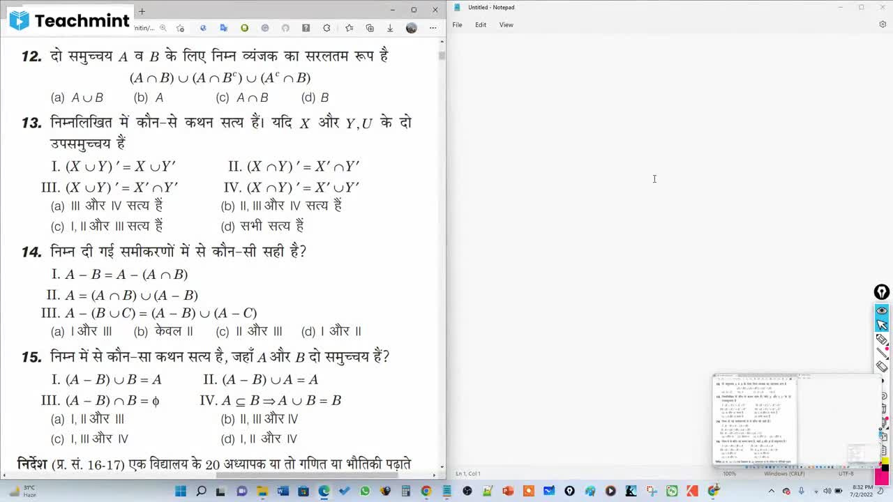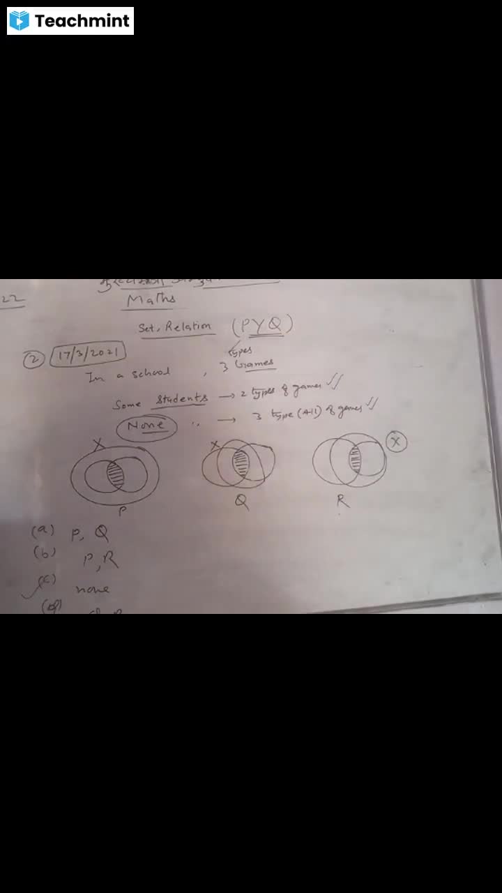 EBD_7762, 8, , MATHEMATICS, , (a) X is a proper subset of Y, (b) Y is a proper subset of X, (c) X = Y, (d) X and Y are disjoint sets, 71. Let X = {Ram, Geeta, Akbar} be the set of students of, Class XI, who are in school hockey team and Y = {Geeta,, David, Ashok} be the set of students from Class XI, who, are in the school football team. Then, X Ç Y is, (a) {Ram, Geeta}, (b) {Ram}, (c) {Geeta}, (d) None of these, 72. Which of the following represent A – B?, (a) {x : x Î A and x Î B}, (b) {x : x Î A and x Ï B}, (c) {x : x Î A or x Î B}, (d) {x : x Î A or x Ï B}, 73. The shaded region in the given figure is, , È, , A, , of all right-angled triangles. What do the sets P Ç Q and, R – P represents respectively ?, (a) The set of isosceles triangles; the set of nonisosceles right angled triangles, (b) The set of isosceles triangles; the set of right angled, triangles, (c) The set of equilateral triangles; the set of right angled, triangles, (d) The set of isosceles triangles; the set of equilateral, triangles, 79. If aN = {ax : x Î N} and bN Ç cN = dN, where b, c Î N are, relatively prime, then, (a) d = bc, (b) c = bd, (c) b = cd, (d) None of these, 80. If U = {1, 2, 3, 4, 5, 6, 7, 8, 9, 10}, A = {1, 2, 3, 5},, B = {2, 4, 6, 7} and C = {2, 3, 4, 8}, then which of the, following is true?, (a) ( B È C)¢ = {1, 5, 9, 10}, , B, , C, (a) A Ç (B È C), (b) A È (B Ç C), (c) A Ç (B – C), (d) A – (B È C), 74. If A and B are non-empty subsets of a set, then, (A – B) È (B – A) equals to, (a) (A Ç B) È (A È B) (b) (A È B) – (A – B), (c) (A È B) – (A Ç B) (d) (A È B) – B, 75. Let A, B, C are three non-empty sets. If A Ì B and B Ì C,, then which of the following is true?, (a) B – A = C – B, (b) A Ç B Ç C = B, (c) A È B = B Ç C, (d) A È B È C = A, 76. In the Venn diagram, the shaded portion represents, , È, , 81., 82., 83., , 84., 85., , A, , (b) (C – A )¢ = {1, 2, 3, 5, 6, 7, 9, 10}, (c) Both (a) and (b), (d) None of these, If A and B are any two sets, then A È (A Ç B) is equal to, (a) A, (b) B, (c) Ac, (d) Bc, The smallest set A such that A È {1, 2} = {1, 2, 3, 5, 9} is, (a) {2, 3, 5}, (b) {3, 5, 9}, (c) {1, 2, 5, 9}, (d) None of these, Consider the following relations :, I. A = (A Ç B) È (A – B), II. A – B = A – (A Ç B), III. A – (B È C) = (A – B) È (A – C), Which of these is correct?, (a) I and III, (b) I and II, (c) Only II, (d) II and III, If A and B are non-empty sets, then P(A) È P(B) is equal to, (a) P(A È B), (b) P(A Ç B), (c) P(A) = P(B), (d) None of these, Let U be the set of all boys and girls in school. G be the, set of all girls in the school. B be the set of all boys in, the school and S be the set of all students in the school, who take swimming. Some but not all students in the, school take swimming., U, , (a) complement of set A (b) universal set, (c) set A, (d) None of these, 77. Let A = {3, 6, 9, 12, 15, 18, 21}, B = {4, 8,12, 16, 20}, C = {2, 4, 6, 8, 10, 12, 14, 16}, and D = {5, 10, 15, 20}, Which of the following is incorrect?, I. A – B = {4, 8, 16, 20}, II. (C – B) Ç (D – B) = f, III. B – C ¹ B – D, (a) Only I & II, (b) Only II & III, (c) Only III & I, (d) None of these, 78. Let S = the set of all triangles, P = the set of all isosceles, triangles, Q = the set of all equilateral triangles, R = the set, , (a), , B, , G, , U, , (b), , S, , B, , S, , G, , U, , (c), , S, B, , G, , (d), , None of these, , 86. If A and B are two sets, then (A – B) È (B – A) È (A Ç B), is equal to, (a) Only A, (b) A È B, ¢, (c) ( A È B), (d) None of these