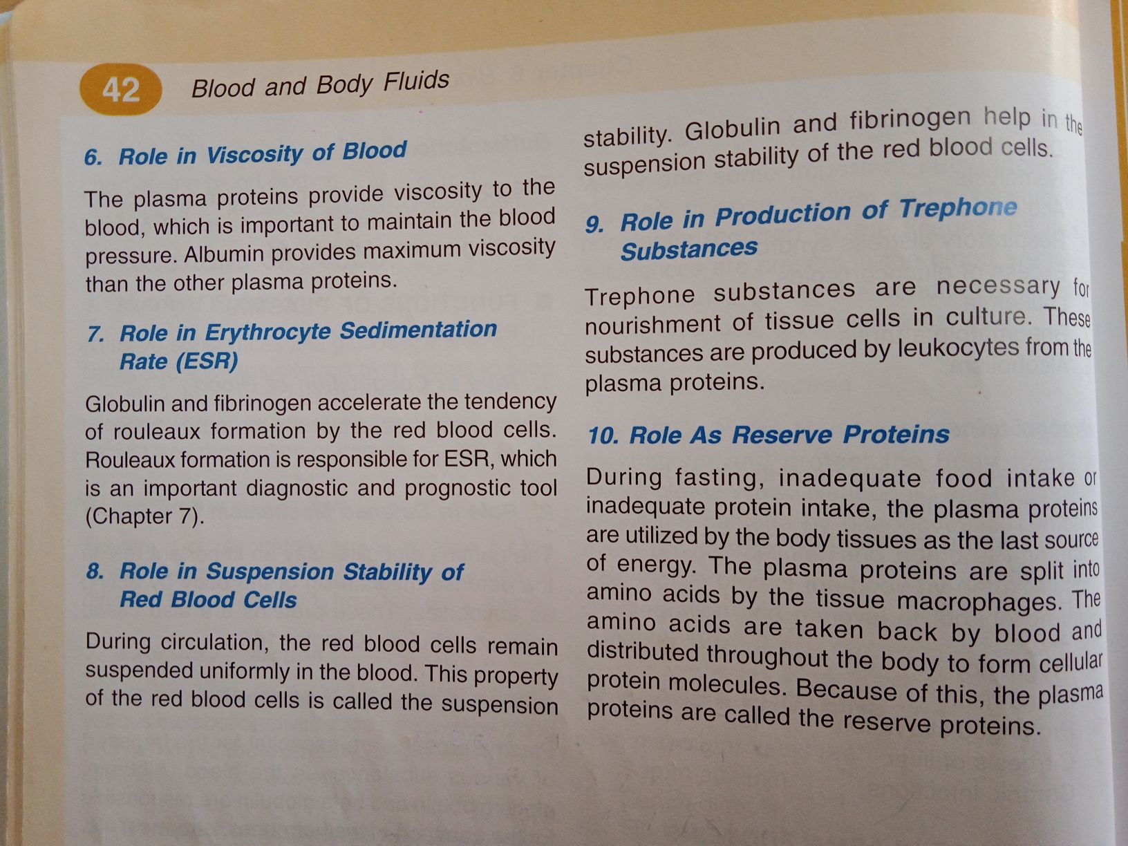 Blood and Body Fluids, , 6. Role in Viscosity of Blood, , The plasma proteins provide viscosity to the, blood, which is important to maintain the blood, pressure. Albumin provides maximum viscosity, than the other plasma proteins., , 7. Role in Erythrocyte Sedimentation, Rate (ESR), , Globulin and fibrinogen accelerate the tendency, of rouleaux formation by the red blood cells., Rouleaux formation is responsible for ESR, which, is an important diagnostic and prognostic tool, (Chapter 7)., , 8. Role in Suspension Stability of, Red Blood Cells, , During circulation, the red blood cells remain, suspended uniformly in the blood. This property, of the red blood cells is called the suspension, , , , , nd fibrinogen help in jp,, , lity. Globulin a, stability of the red blood cells., , suspension stability, , 9. Role in Production of Trephone, Substances, , Trephone substances are necessary for, nourishment of tissue cells in culture. These, substances are produced by leukocytes from the, plasma proteins., , 10. Role As Reserve Proteins, , During fasting, inadequate food intake o, inadequate protein intake, the plasma proteins, are utilized by the body tissues as the last source, of energy. The plasma proteins are split into, amino acids by the tissue macrophages. The, amino acids are taken back by blood and, , distributed throughout the body to form cellull, protein molecules, > of this, the plasm, proteins are ; a