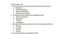 Life Processes, , 40., , 41., , 42., , 43., , 44,, , 45,, , 46., , 47,, , 48., , Which one of the following organisms respires through, the skin?, , (a) Blue whale, (c) Platypus, , (b) Salamander, (d) Peacock, , The first enzyme that the food encounters in human, digestive system is, (a) Pepsin, , (c) Chymotrypsin, Red blood corpuscles are formed in, , (a) Liver (b) Kidneys, , (c) Small intestine (d) Bone marrow, , (b) Trypsin, (4) Amylase, , The Excretory units of Annelids are:, (a) Uniferous tubule (b) Flame cells, , (c) Nephridia (d) Malpighian tubule, Open circulatory system is found in:, , (a) Prawn (b) Snakes, , (c) Fish (d) Man, Haemoglobin is dissolved in Plasma of blood in:, , (a) Earthworm, (©) Tapeworm, , (b) Roundworm, (d) Insects, , Which one of the following organisms has a cellular, respiratory pigment dissolved in plasma and is also a, predaceous carnivore and shows matriphagy?, , (a) Scorpion (b) Cockroach, , (c) Earthworm (d) Sea cucumber, , Glucose is the prime source of energy in our body., However, it is stored in the form of glycogen in the, muscle and liver of animals and in the form of starch in, plants. As a result, everytime a cell requires glucose, it, must hydrolyze glycogen which is an energy consuming, process. Why does the cell store glycogen instead of, glucose in free form?, (a) Glycogen is more compact and more hydrophilic., (b) Storage of glucose in free form will consume more ATP., (c) Glucose in the free form creates more osmotic pressure., (a) Glucose is highly reactive molecule hence storing in, the free form can result in unwanted reactions in the, cells., , A squirrel was eating a fruit on the ground, Suddenly, it, was attacked by a dog. The squirrel rushed to the tree, immediately and saved itself from the dangerous attack., What immediate changes are most likely to have taken, place in the body of the squirrel?, , ‘A. Blood flows to the stomach for rapid digestion, , 49., , 50., , 51., , 52., , 53., , 54,, , 55., , B. Adrenaline was secreted in the blood by the adrenal, glands,, , C. Heart beat becomes faster and pumps more blood so, that muscles get more oxygen., , D. Adrenocorticotropic hormone is secreted in the, blood and blood flows more towards the vital organs., , Select the correct combination of options given below:, , (a) AandB (b) AandC, , (c) BandC (@) CandD, , Removal of the pancreas impairs the breakdown of, (a) lipids and carbohydrates only, , (b) lipids and proteins only, , (c) lipids, proteins and carbohydrates, , (d) proteins and carbohydrates only, , Microscopic examination of a blood smear reveals an, abnormal increase in the number of granular cells with, multiple nuclear lobes. Which one of the following cell, ‘Types has increased in number?, , (a) Lymphocytes (b) Monocytes, , (c) Neutrophils (d) Thrombocytes, , Which one of the following metabolic conversions, requires oxygen?, , (a) Glucose to pyruvate, , (b) Glucose to CO, and ethanol, , (c) Glucose to lactate, , (a) Glucose to CO, and H,O, , Which one of the following organs is NOT a site for the, production of white blood cells?, , (b) Kidney, , (d) Spleen, , (a) Bone marrow, (c) Liver, , Which of the following process occur only in animals?, (b) Nutrition, , (d) Hormonal control, , (a) Respiration, (c)_ Nervous control, , Tricuspid valve is present in, (a) Right atria and right ventricle, , (b) Left atria and left ventricle, , (c) Wall of atrium, , (d) Wall of vetricle, , Root pressure is effective way transporting water in, xylem. This pressure is generated, , (a) In bright sunlight, , (b) During night, , (©) Atvery low temperature, , (d) In high trees