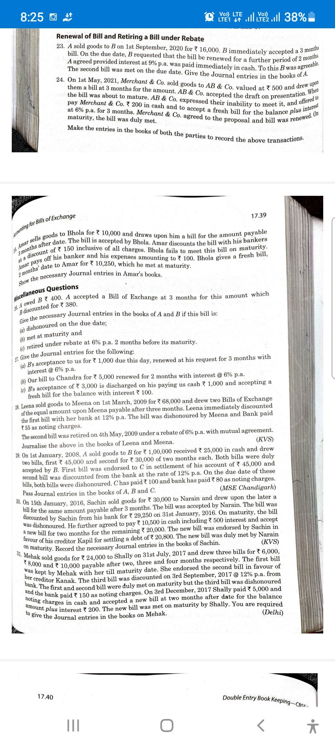 PA By Vo1), , Rama aca iets, , , , () Gi, 24. On Ist May, 2021, Merchant & Co Te eel Se ie, | them a bill at 3 months for the amo Sold goods to AB & Co, valued at % 500 and drew 7, , the bill was about to Co., , j mature, . accept a, , } pay Merchant & Co, % 200 ee & Co. expressed ee the draft on presentaie vei, , mi at 6% p.a. for 3 months, Marche inability to meet it, and 8", maturity, the bill was duly met, nied,, , ‘ys of Exchange, for Bills, ing, fe, f sells joe ee % 10,000 and draws upon him a bill for the amount payable, frer date. The bill is accepted by Bhola, Aj i “11 with his bank, Months 2 of & 150 inclusive of all ch 1, Amar discounts the bill with his banker, 3m giscoum his banker and hi charges. Bhola fails to meet this bill on maturity., 8 pays off BY Foe acy Penses amounting to % 100, Bhola gives @ fresh bill,, A ahs! date to Amar for 10,250, which he met at maturity., » the necessary Journal entries in Amar’s books,, , 17.39, , show, , tian :, us ogee B CO A accepted a Bill of Exchange at 3 months for this amount which, , Gaenunted for © 380., , give the necessary Journal entries in the books of A and B if this bill is:, ) gishonoured on the due date;, (a), , eous Questions, , () met at maturity and, , @ retired under rebate at 6% p.a. 2 months before its maturity., y Give the Journal entries for the following:, 5 @ Bs acceptance to us for % 1,000 due this day, renewed at his request for 3 months with, interest @ 6% p.a( Our pill to Chandra for & 5,000 renewed for 2 months with interest @ 6% p.a., | @ B's acceptance of % 3,000 is discharged on his paying us cash % 1,000 and accepting a, fresh bill for the balance with interest = 100., | 9B Leena sold goods to Meena on 1st March, 2009 for % 68,000 and drew two Bills of Exchange, ofthe equal amount upon Meena payable after three months. Leena immediately discounted, the first bill with her bank at 12% p.a. The bill was dishonoured by Meena and Bank paid, %55 as noting charges., , , , The second bill was retired on Ath May, 2009 under a rebate of 6% p.a. with mutual agreement., Journalise the above in the books of Leena and Meena. (KVS), , 29. On 1st January, 2008, A sold goods to B for % 1,00,000 received & 25,000 in cash and drew, two bills, first = 45,000 and second for 30,000 of two months each. Both bills were duly, accepted by B. First bill was endorsed to C in settlement of his account of 45,000 and, second bill was discounted from the bank at the rate of 12% p.a. On the due date of these, bills, both bills were dishonoured. C has paid 100 and bank has paid % 80 as noting charges., Pass Journal entries in the books of A, B and C. (MSE Chandigarh), , 40. On 15th January, 2016, Sachin sold goods for & 30,000 to Narain and drew upon the later a, , bill for the same amount payable after 3 months. The bill was accepted by Narain. The bill was, , discounted by Sachin from his bank for € 29,250 on 31st January, 2016. On maturity, the bill, , Was dishonoured. He further agreed to pay © 10,500 in cash including % 500 interest and accept., , anew bill for two months for the remaining & 20,000. The new bill was endorsed by Sachin in, , favour of his creditor Kapil for settling a debt of € 20,800. The new bill was duly met by Narain, on maturity, Record the necessary Journal entries in the books of Sachin. (KVS), , Mehak sold goods for % 24,000 to Shally on 31st July, 2017 and drew three bills for = 6,000,, , 8,000 and % 10,000 payable after two, three and four months respectively. The first bill, , Was kept by Mehak with her till maturity date. She endorsed the second bill in favour of, , i creditor Kanak. The third bill was discounted on 3rd September, 2017 @ 12% p.a. from, , ial The first and second bill were duly met on maturity but the third bill was dishonoured, , Me bank paid % 150 as noting charges. On 3rd December, 2017 Shally paid = 5,000 and, , am, ig charges in cash and accepted a new pill at two months after date for the balance, unt plus interest Z 200. The new bill was met on maturity by Shally. You are required, , 3, , 8ive the Journal entries in the books on Mehak. (Delhi), , , , 17.40, Double Entry Book Ke, ping., CBee., , MI O { ¢