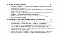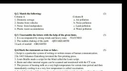 FINAL EXAMINATION 2021-2022, , , , CLASS-V, SUBJECT - SOCIAL STUDIES, Time 2 hrs MM60, Q.L. Tick the correct option:. (20), 1. Smoke from factories and vehicles are major sources of pollution., a. air b. water —_c. land d. noise, , 2. Consumption of unclean water can cause a disease like, , a. asthma b. cholera c. chickenpox d. measles, , 3. Air and noise pollution is caused by, , a. bursting crackers b. plastics c. chemicals d. sandstorm, , 4. The Lava erupt out of a during a volcanic eruption, , a.Magma b.cut c.hole d. vent, , S.A. occurs when a region does not received enough rainfall, a.drought b. earthquake c. flood —_d. cyclone, , 6. The sudden shaking of the earth is called a/an., , a.Tsunami —b. earthquake. flood. cyclone, , 7. The Brahmi script or the Indian script was developed nearly____ years ago., a.1000 b.2500 c.600 4.100, , 8. The concept of decimal was introduced by the, , a. European b. Americans c. Indians__d. Chinese, , 9. The first book to be printed by the printing press was, , a. The Bible b. The Ramayana c. The Vedas d. The Puranas, 10. Louis Pasteur, a French scientist introduced the concept of, , , , a. antibiotics b. antiseptics c. pasteurization d. vaccination, , tL. is an instrument used to hear the heartbeat, , a.CT scan _ b. ultrasound c. stethoscope d.MRI, , 12. makes a person unconscious and was earlier used in surgeries., a. carbolic acid b. Chloroform _ c. Antiseptic d. Penicillin, 13. The British took control of Indian territories under, , a. doctrine of lapse b. subsidiary alliance c. both of these, , 14. After the 1857 revolt, India was placed under the direct control of, a.The king — b. The traders c. The East India company __d. The British crown, 15. The newly introduced cartridges were called, , , , a. Bullets b. Enfield c, Fatsod cartrael, , 16. The Indian National Congress was founded by, , a. Jawaharlal Nehru b. W.C. Banerjee —_c. R-C.Majumdar d. A.O.Hume, 17. UN stands for, , a, United Nations __b. United Natives c. Union of Nations d. Union of Natives, , 18. Which of the following is not a UN agency, , a. UNESCO _b. Greenpeace c.WHO d.ILO, , 19. The first secretary General of the UN was, , a. Jawaharlal Nehru b. Kofi Annan __c.. Trygve Lie d. Kurt Waldheim, 20. General assembly is the. organ of the UN, , a. Central b. unimportant c. useful d. common