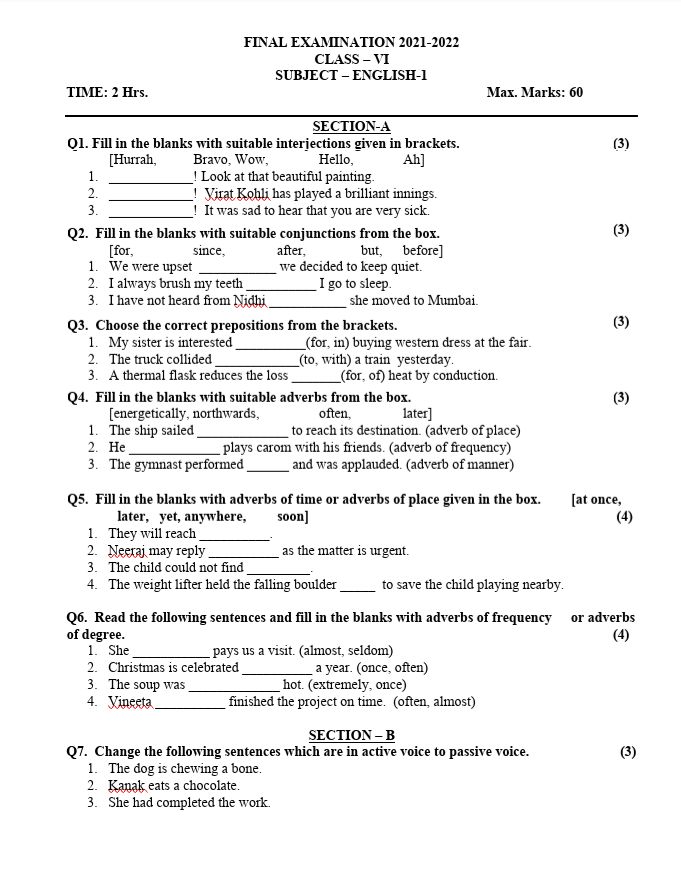 FINAL EXAMINATION 2021-2022, CLASS - VI, SUBJECT - ENGLISH-1, TIME: 2 Hrs. ‘Max. Marks: 60, , , , ‘SECTION-A, 1. Fill in the blanks with suitable interjections given in brackets. @), [Hurrah, Bravo, Wow, Hello, Ab], ! Look at that beautiful painting, | Yirat Kobli has played a brilliant innings., | Itwas sad to hear that you are very sick., Q2. Fill in the blanks with suitable conjunctions from the box. @), [for, since, after, but, before], 1. We were upset wwe decided to keep quiet., 2. Talways brush my teeth Igo to sleep., 3. Ihave not heard from Nidhi, she moved to Mumbai., , Q3. Choose the correct prepositions from the brackets. 8), 1. My sister is interested (for. in) buying westem dress at the fair., 2. The truck collided (to, with) a train yesterday., 3. A thermal flask reduces the loss (for. of) heat by conduction., Q4. Fill in the blanks with suitable adverbs from the box. @), (energetically, northwards, often, later], 1. The ship sailed to reach its destination. (adverb of place), 2. He plays carom with his friends. (adverb of frequency), 3. The gymnast performed and was applauded. (adverb of manner), , QS. Fill in the blanks with adverbs of time or adverbs of place given in the box. _[at once,, , , , later, yet, anywhere, soon] @, 1. They will reach, 2. Neetajmay reply as the matter is urgent., 3. The child could not find, 4. The weight lifter held the falling boulder to save the child playing nearby., Q6. Read the following sentences and fill in the blanks with adverbs of frequency or adverbs, of degree. @, 1 She pays us a visit. (almost, seldom), 2. Christmas is celebrated a year. (once, often), 3. The soup was hhot. (extremely. once), 4. Ninesta finished the project on time. (often, almost), SECTION -B, QZ. Change the following sentences which are in active voice to passive voice. @), , , , 1. The dog is chewing a bone., 2. Kanak. eats a chocolate, 3. She had completed the work.