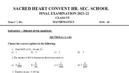FINAL EXAMINATION 2021- 22, General knowledge, CLASS – VII, M.M = 40, Choose the Correct option :, , [1×15=15], , 1) What is the SI base unit of temperature?, a) Watt, , b) Kelvin, , c) kilometre, , d) pascal, , 2) Which of these is the longest canal?, a) Indira Gandhi nahar ( Rajasthan) b) Panama canal, c) Suez canal, , d) None of these, , 3) Who was the first woman prime minister of India?, a) Priyanka Gandhi, , b) Indira Gandhi, , c) Kiran bedi, , d) None of the above, , 4) Complete the Series:A999, B888,C777,D666 …., 5) What is the SI derived unit of frequency ?, a) Megahertz, , b) Kilowatt, , c) Hertz, , 6) Who among the following is a shehnai maestro?, a) Pandit Ravi Shankar, , b) Ustad Bismillah Khan, , c) Shiv Kumar Sharma, 7) Practice makes a man:a) Idle, , b) Perfect, , 8) Time and tide wait for:a) Everyone, , b) None, , 9) Which of these is the largest temple:a) Golden temple, , b) Akshardhan Temple, , 10) AP9, AQ8,AR7 ,AS6 ……., a) AT10, , b) AT5, , c) BS7, , 11) Malaria : Mosquito ::?: Disease, a) AIDS, , b) Typhoid, , c) Infection, , d) Diabetes