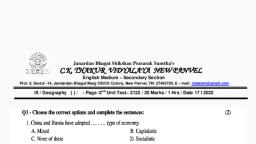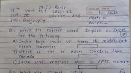 M. S. NAIK HIGH SCHOOL, RATNAGIRI, SECOND UNIT TEST, 2021-2022, , , , , , , , ACTIVITY SHEET, STD:- IX MARKS:- 20, SUB:- GEOGRAPHY TIME:- 1 HOUR, Q.1. Tick in front of the correct option: (2), 1. At which direction of IDL does a new day start?, A. East B. West [1 «=C. North [=| Sov I, , , , , , , , 2. In which year did Adam Smith published his book, ‘Wealth of Nations’?, A. 1767 [1 sB.1876 Esse Gc 1976 a] Ds17/c, , , , , , , , , , , , , , , , , , Q.2. Are the sentences right or wrong? (2), 1. GMT is known as World Standard Time., 2. The word ‘economics’ is derived from the French word ‘OIKONMIA’, , Q.3. Answer the following in one sentence each: (Any 3) (3), 1, What is World Standard Time?, 2. By what time the GMT and IST differ?, 3. To which economic factor is the management of individual or family finance related?, 4. What do you understand by Globalisation?, , Q.4. Which of the following routes the IDL will be crossed? (Any 2) (2), 1. Mumbai — London — New York — Los Angeles, 2. Tokyo — Delhi — Kolkata — Singapore — Melbourne, 3. Chennai — Singapore — Tokyo — Sydney - Santiago, , Q.5. Give geographical reason: (Any 1) (3), 1. IDLis proving to be very useful in today’s time., 2. The day start in the Pacific ocean of the earth., , Q.6. Explain the types of economies by filling correct information in the blanks given in the, table given below: (4), Capitalist Economy 7 i] Mixed Economy ; |, , | 1. Management in the private hands i a p, , a, 5 pe aah eae, , Bis 3. India, Sweden, Brazil,, , The United Kingdom (UK), , , , , , , , Q.7.Answer the following in detail: (Any 1) (4), 1. What considerations have been made while deciding the IDL?, 2. India has mixed economy., , ****All the Best****