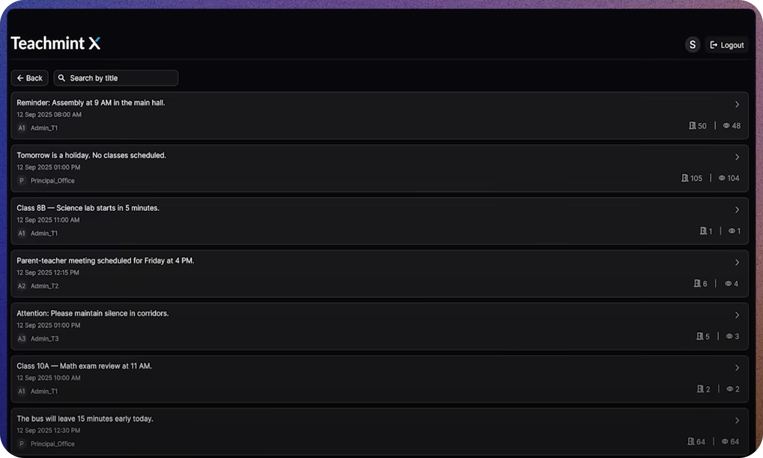Send announcements to all or selected classrooms and track delivery, views, and acknowledgements in real time.